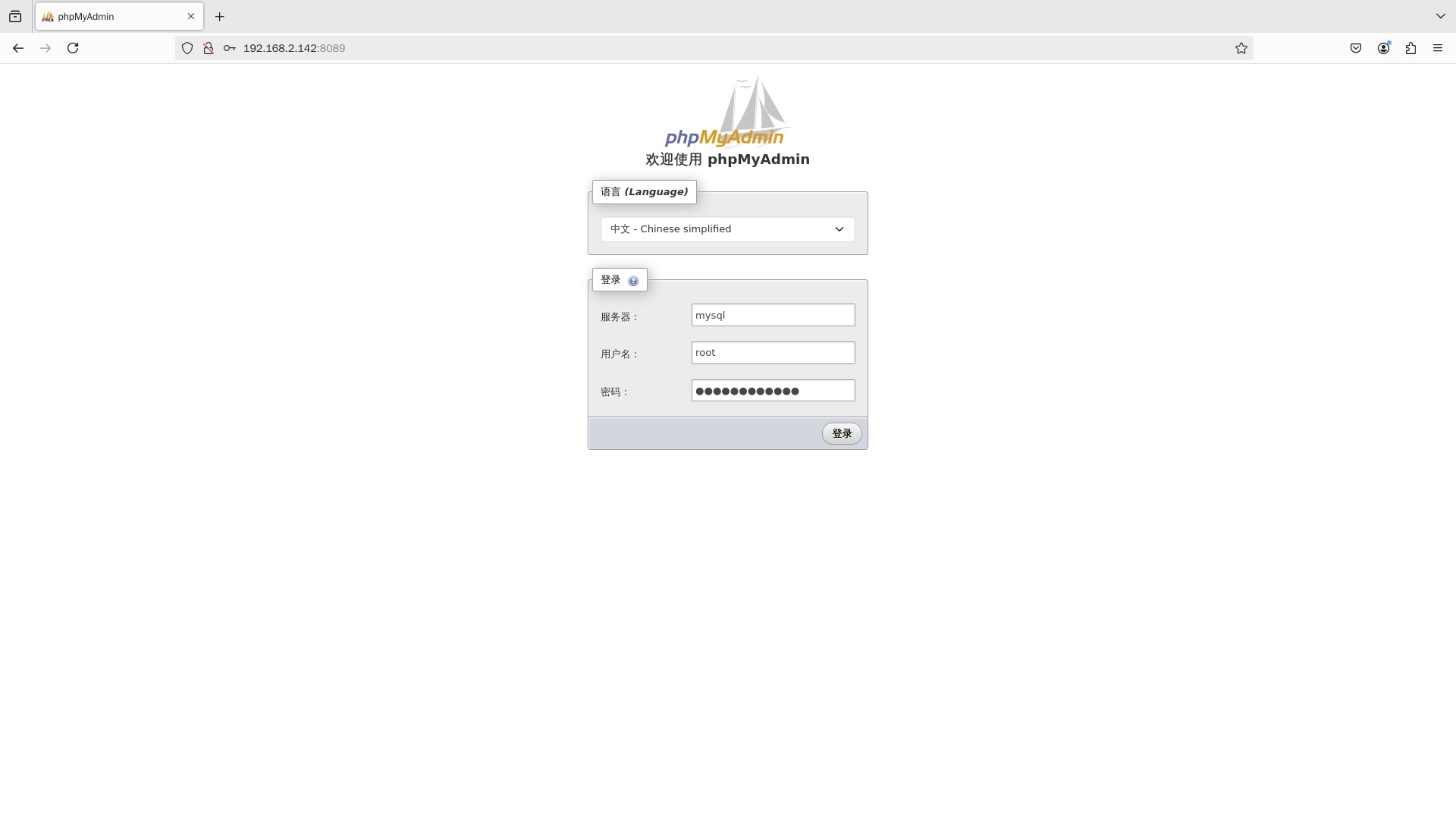 输入http://服务器ip:8099即可进入phpmyadmin登录界面,我的ip是192.168.2.142,所以登录地址是http://192.168.2.142:8099。