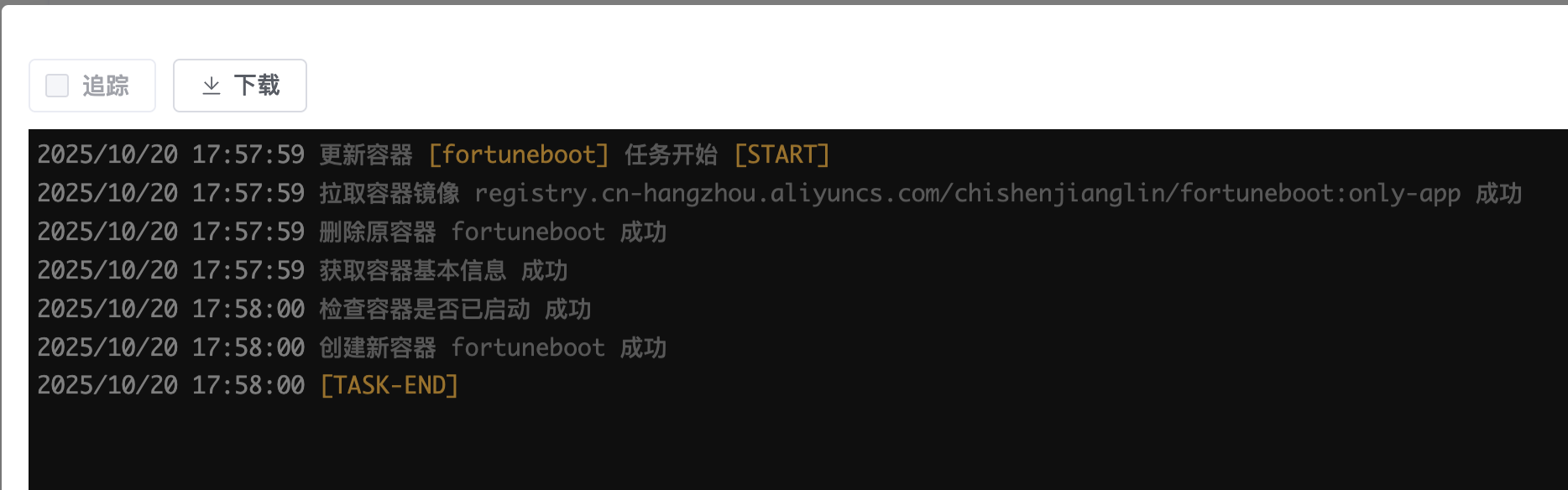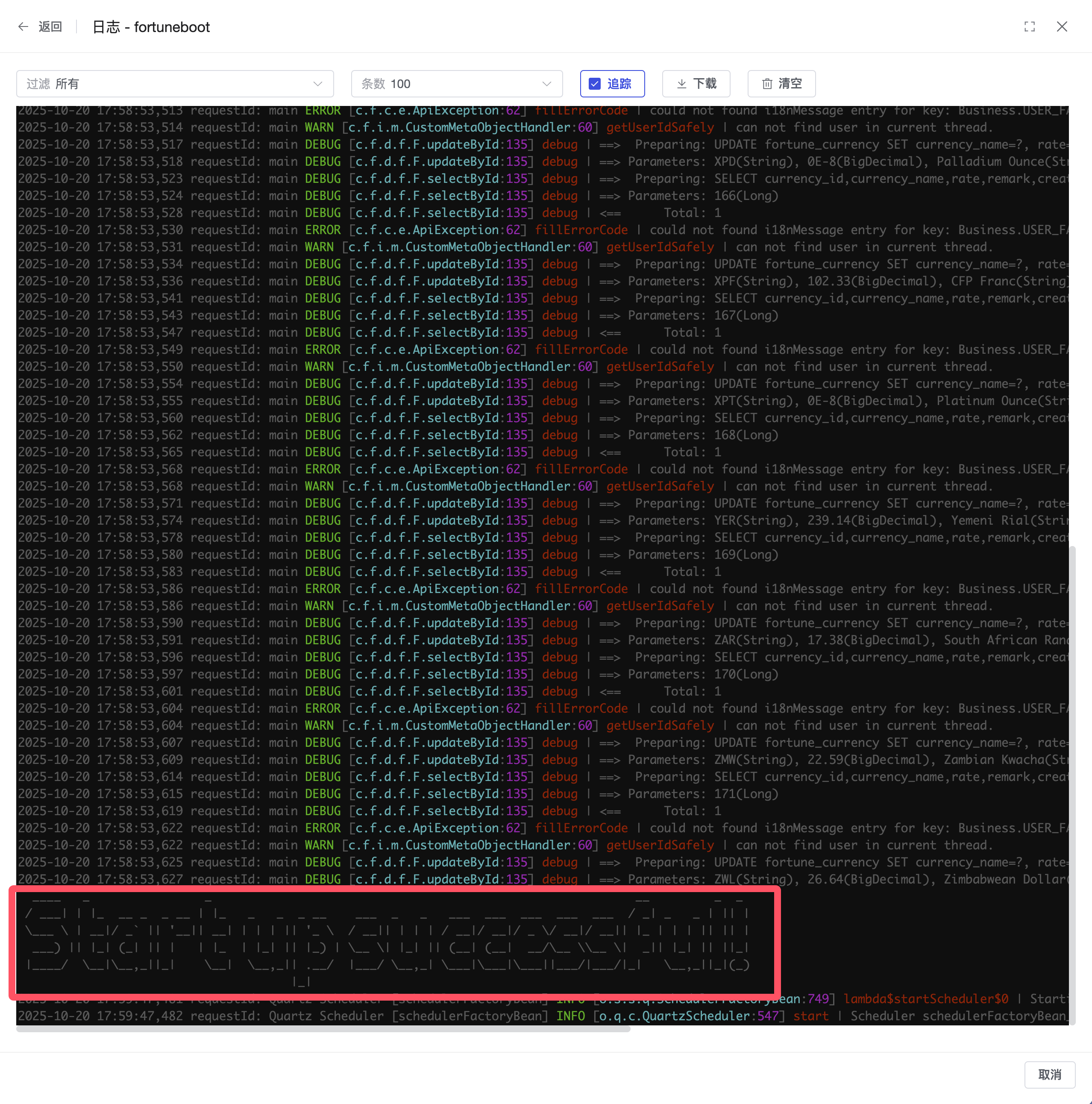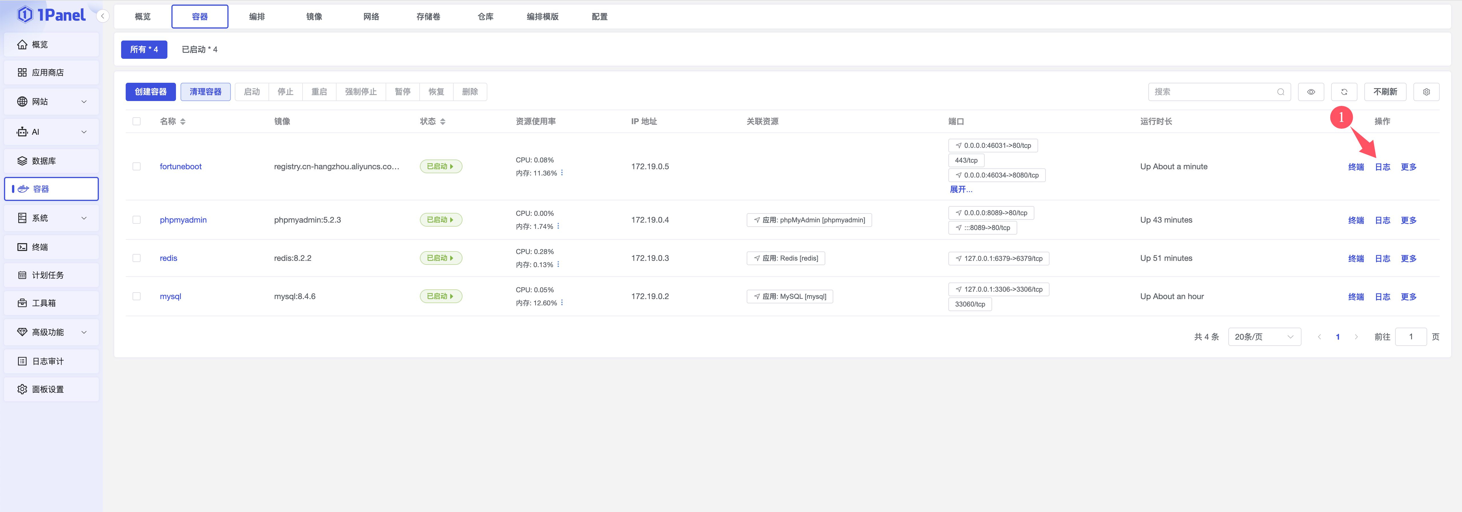 返回容器列表页 -> 点击fortuneboot的日志按钮