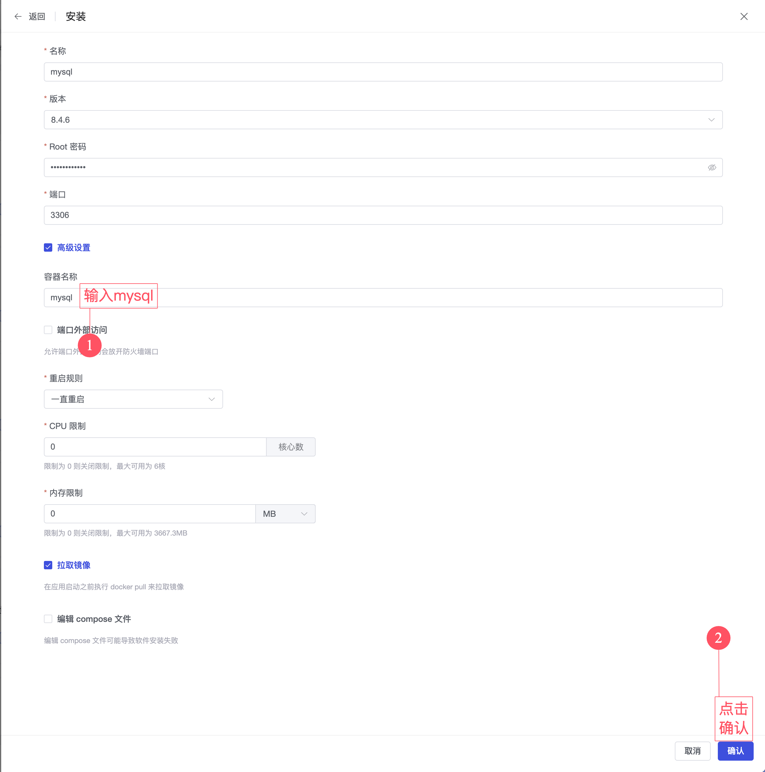 容器名称默认是空,需输入"mysql",其他参数保持默认即可,点击确认。