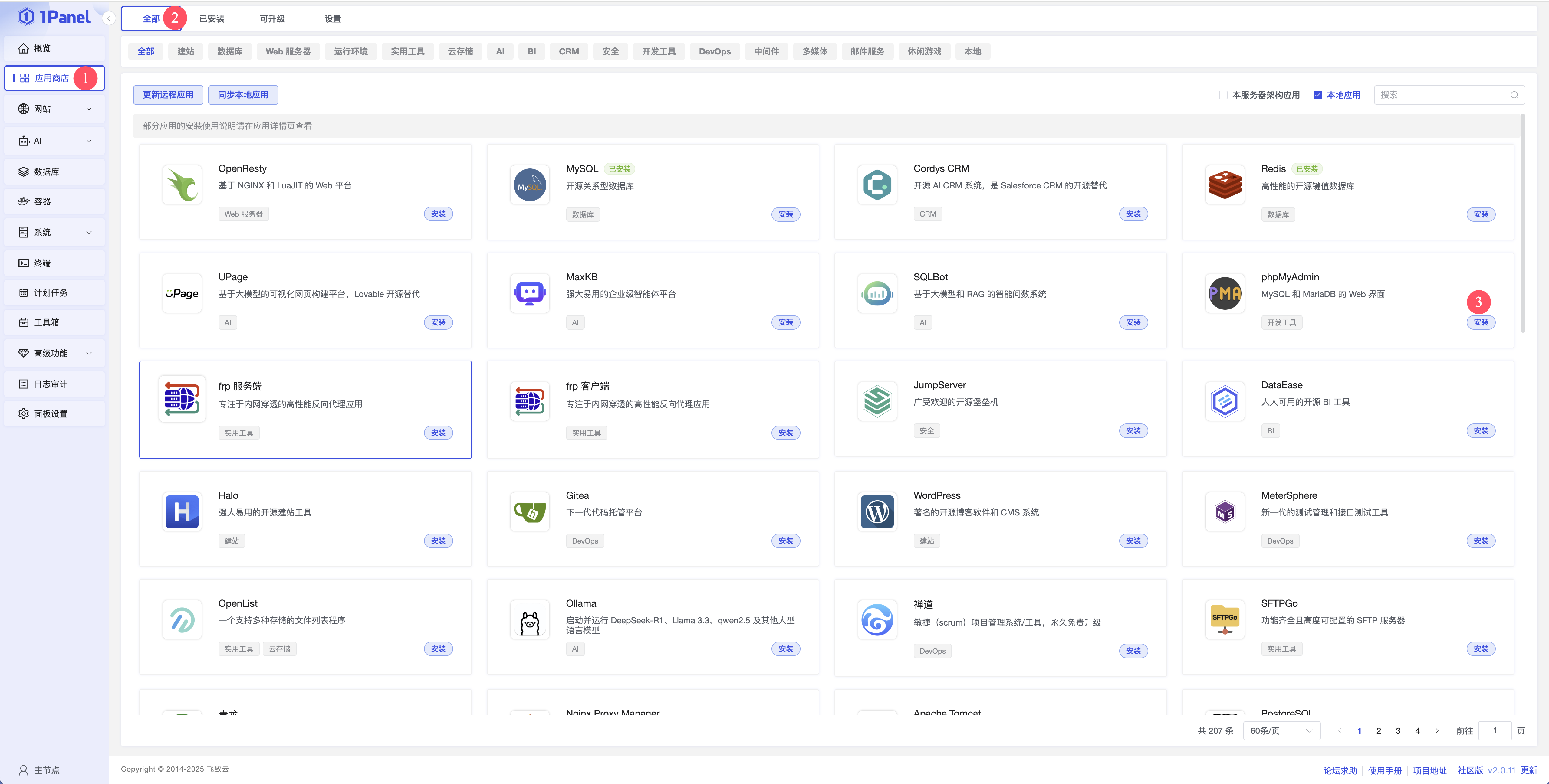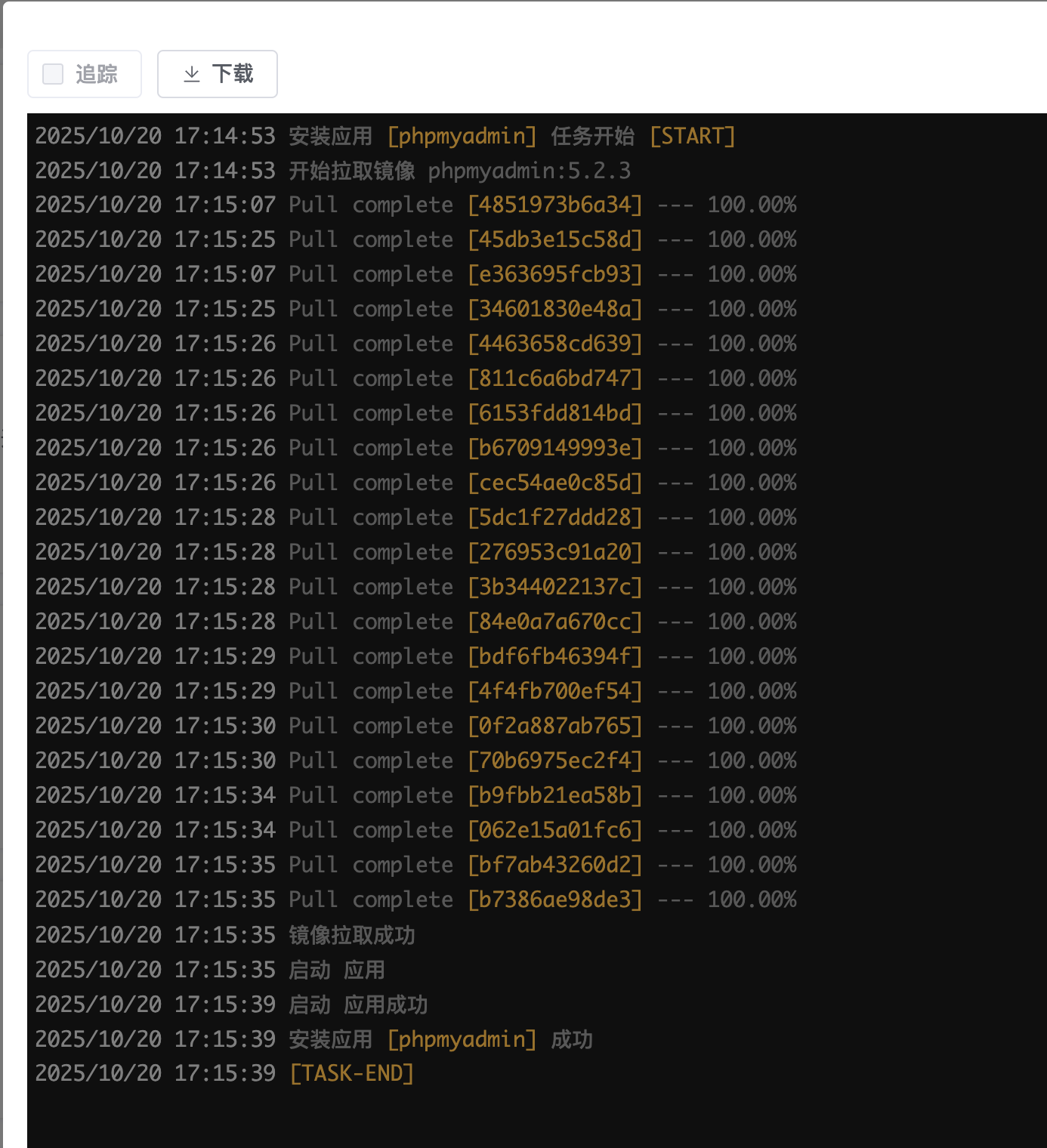 进入1Panel管理页面 -> 点击应用商店 -> 找到phpMyAdmin -> 点击安装 -> 在容器名称处输入“phpMyAdmin”并勾选端口外部访问 -> 点击确认-> 等待几分钟,根据网络、配置不同等待时间不同 -> 显示[TASK-END]表示安装成功。
