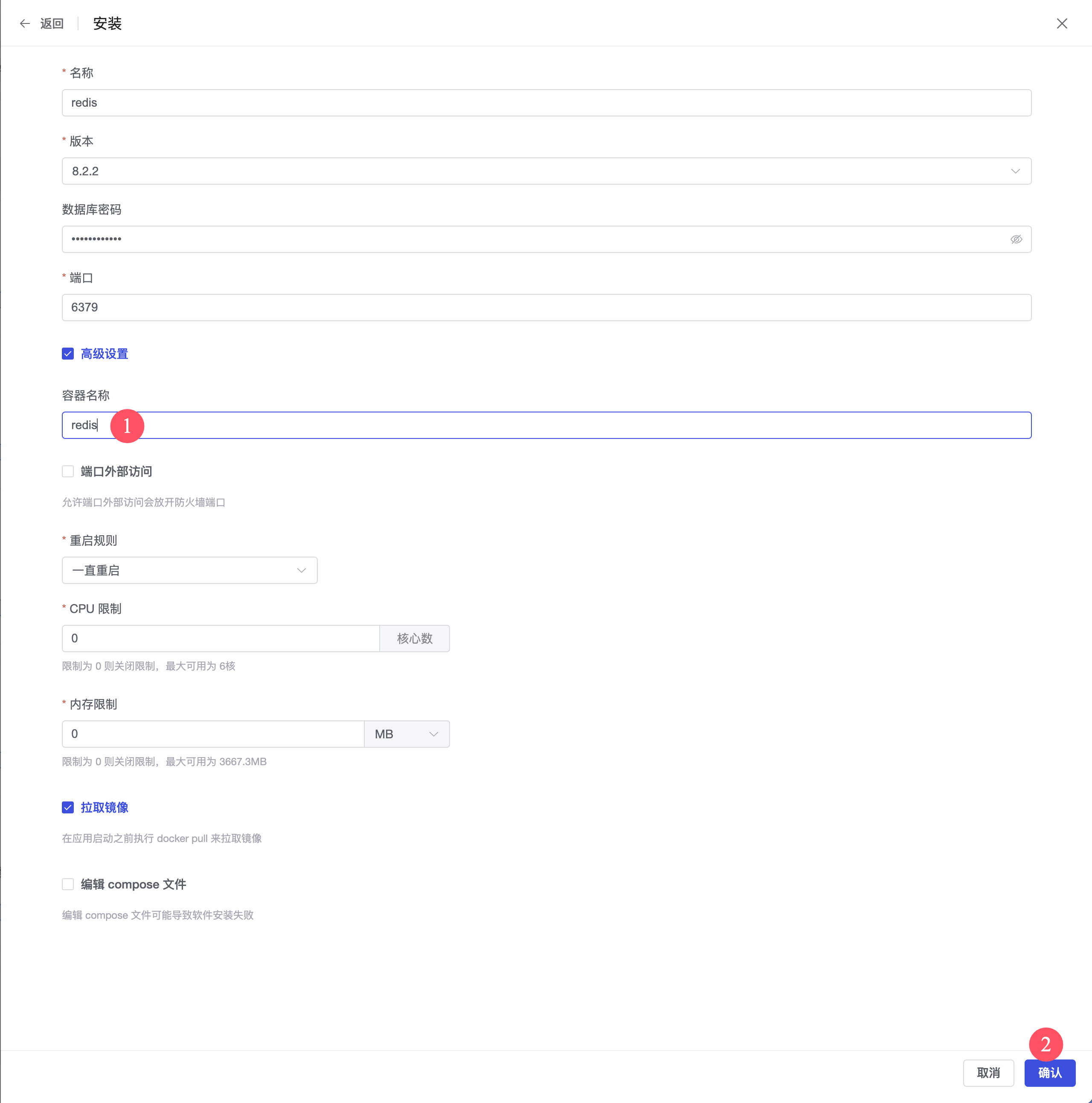 容器名称默认是空,需输入"redis",其他参数保持默认即可,点击确认。
