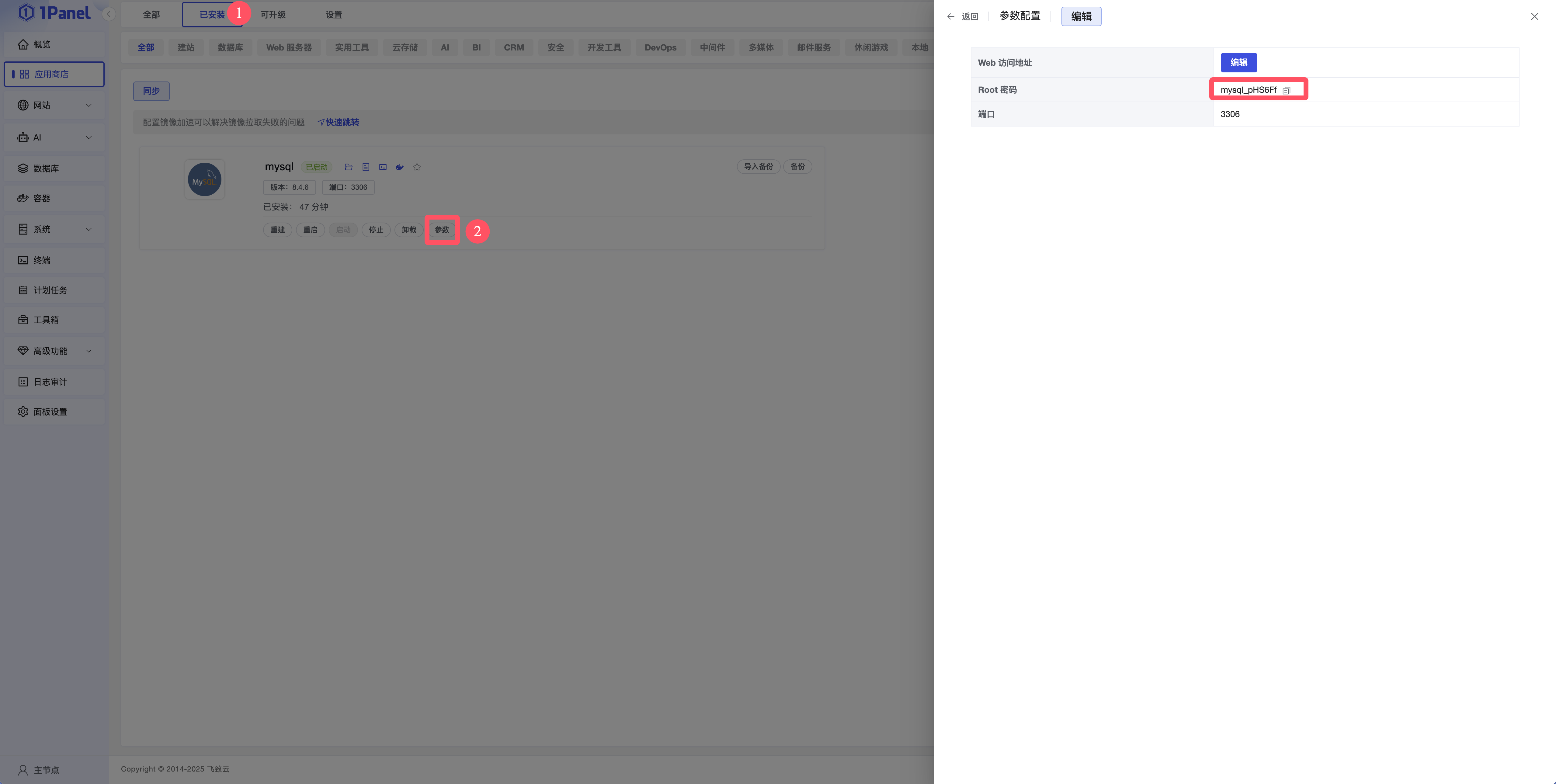 记录mysql密码,后面会用到,忘记了需到这里查看:应用程序 -> 已安装 -> mysql -> 参数 -> Root密码。