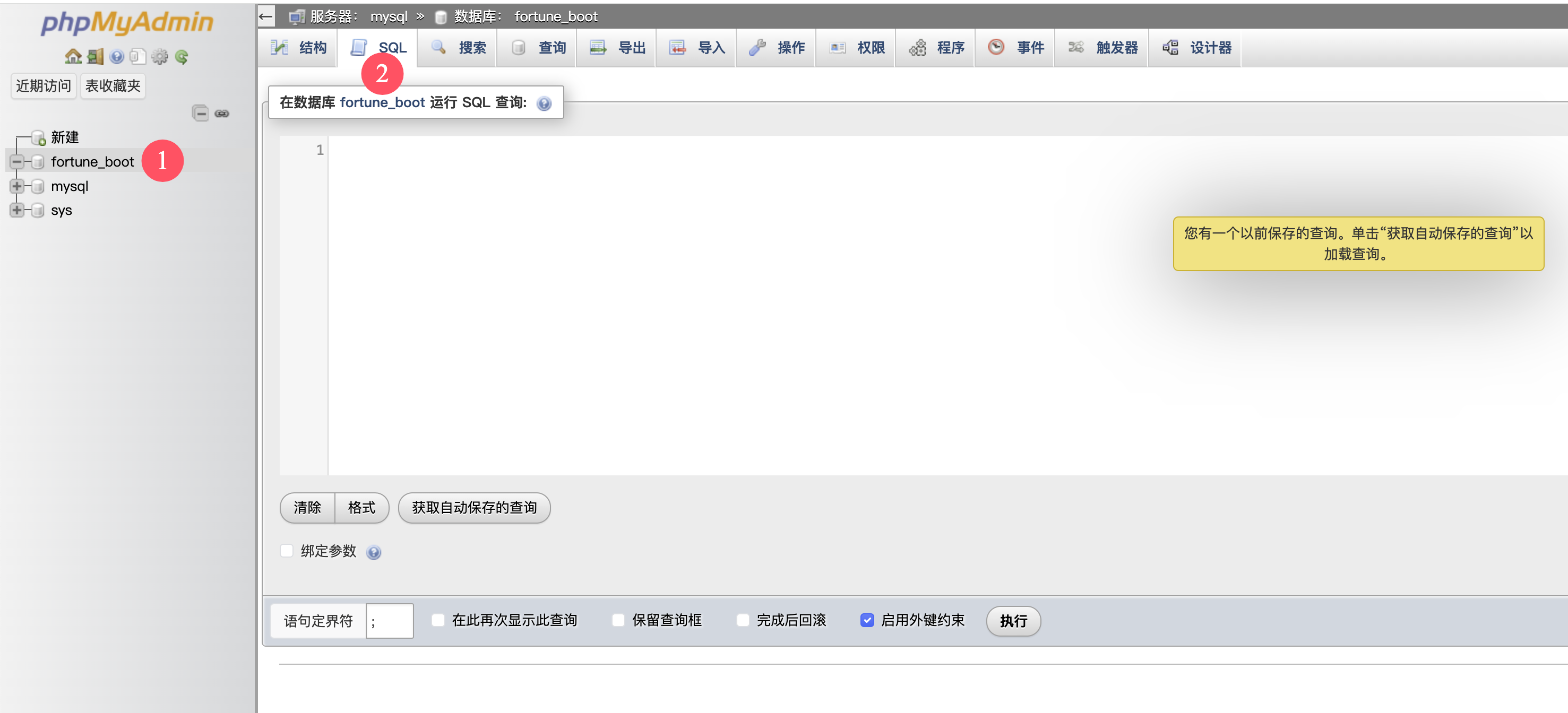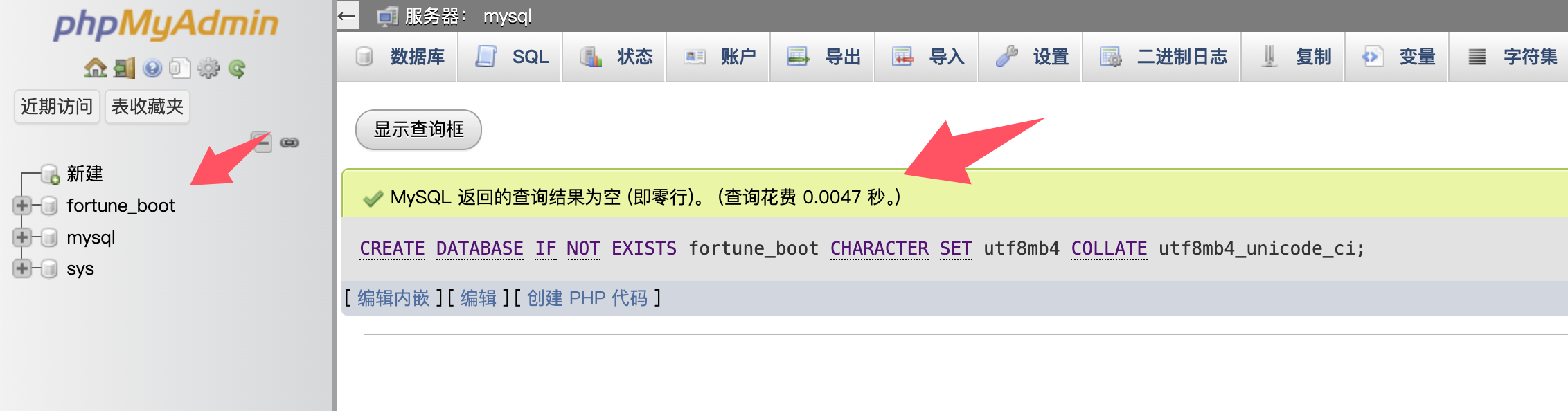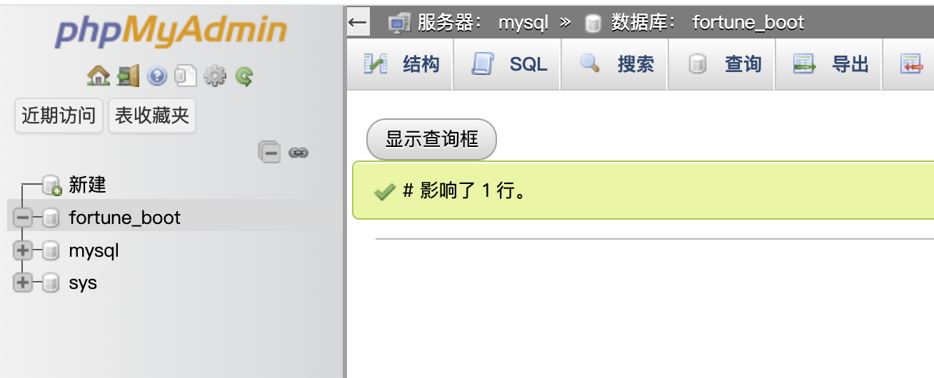 成功后,左侧会多一个fortune_boot的数据库,右侧显示一个黄底绿色对勾开头的提示。