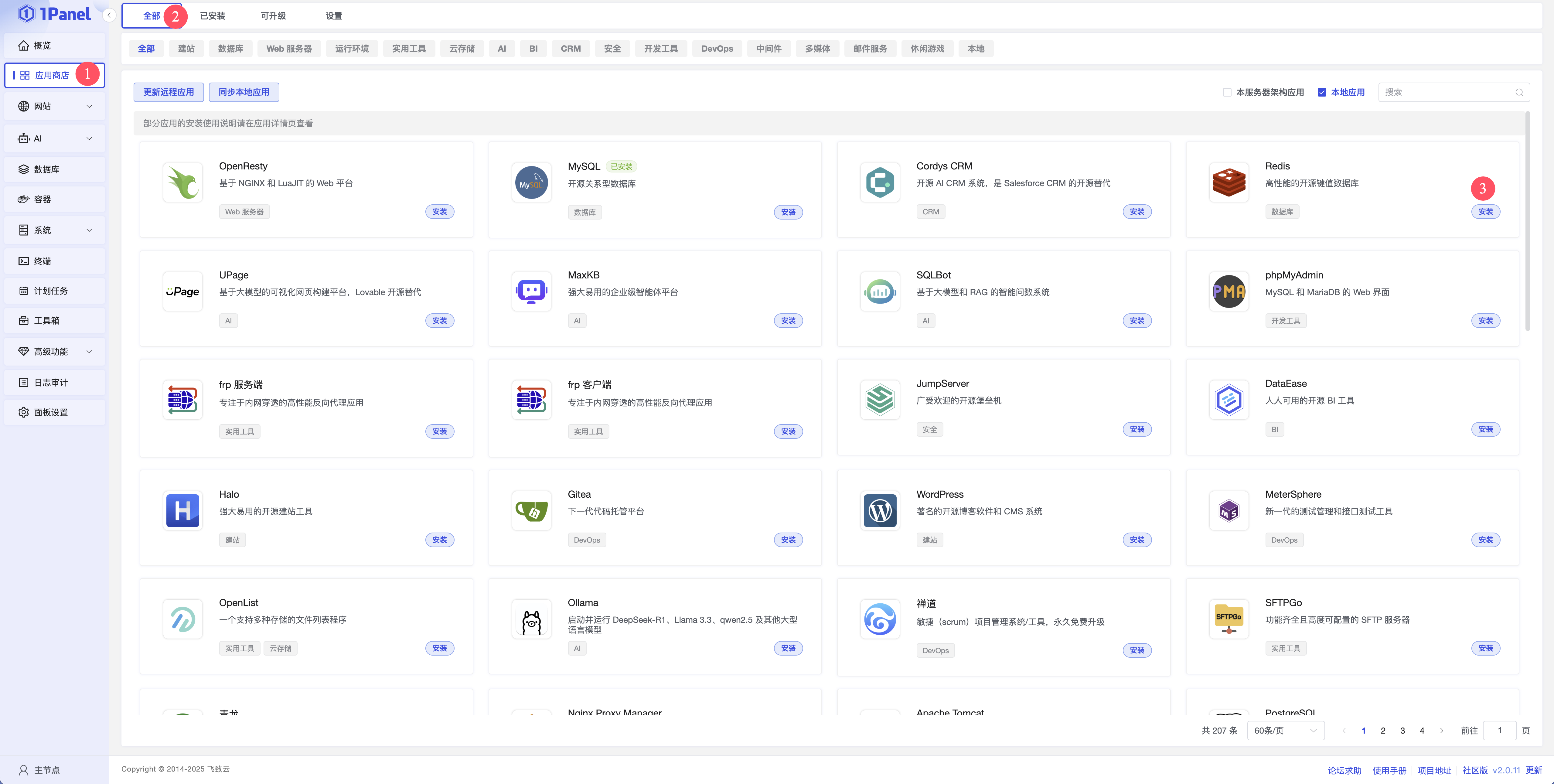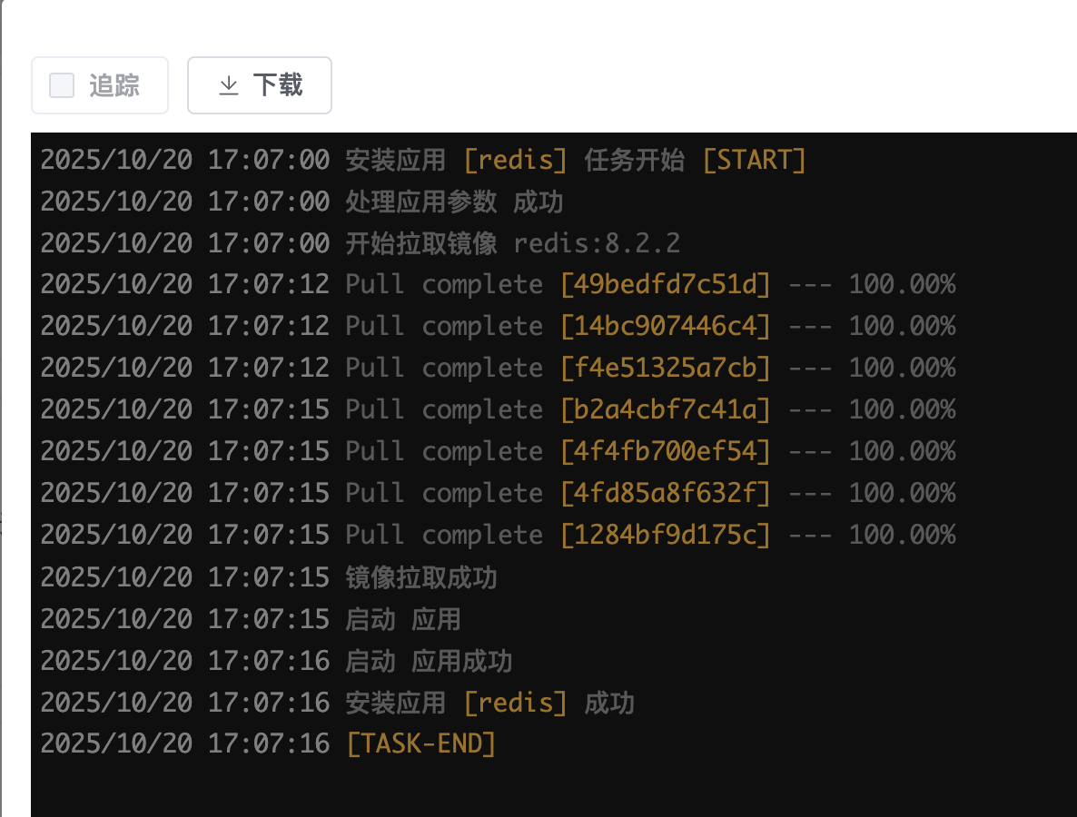 进入1Panel管理页面 -> 点击应用商店 -> 找到Redis -> 点击安装 -> 在容器名称处输入“redis” -> 点击确认 -> 点击确认 -> 等待几分钟,根据网络、配置不同等待时间不同 -> 显示[TASK-END]表示安装成功。