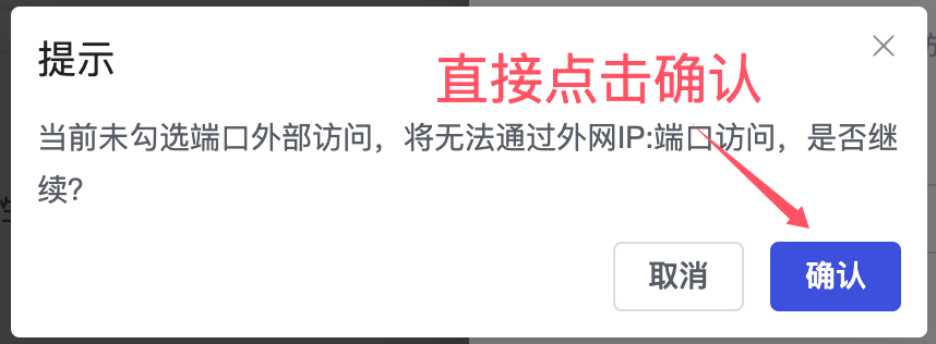 可能会显示无法通过外网IP:端口访问,不用理会,直接点击确认即可。