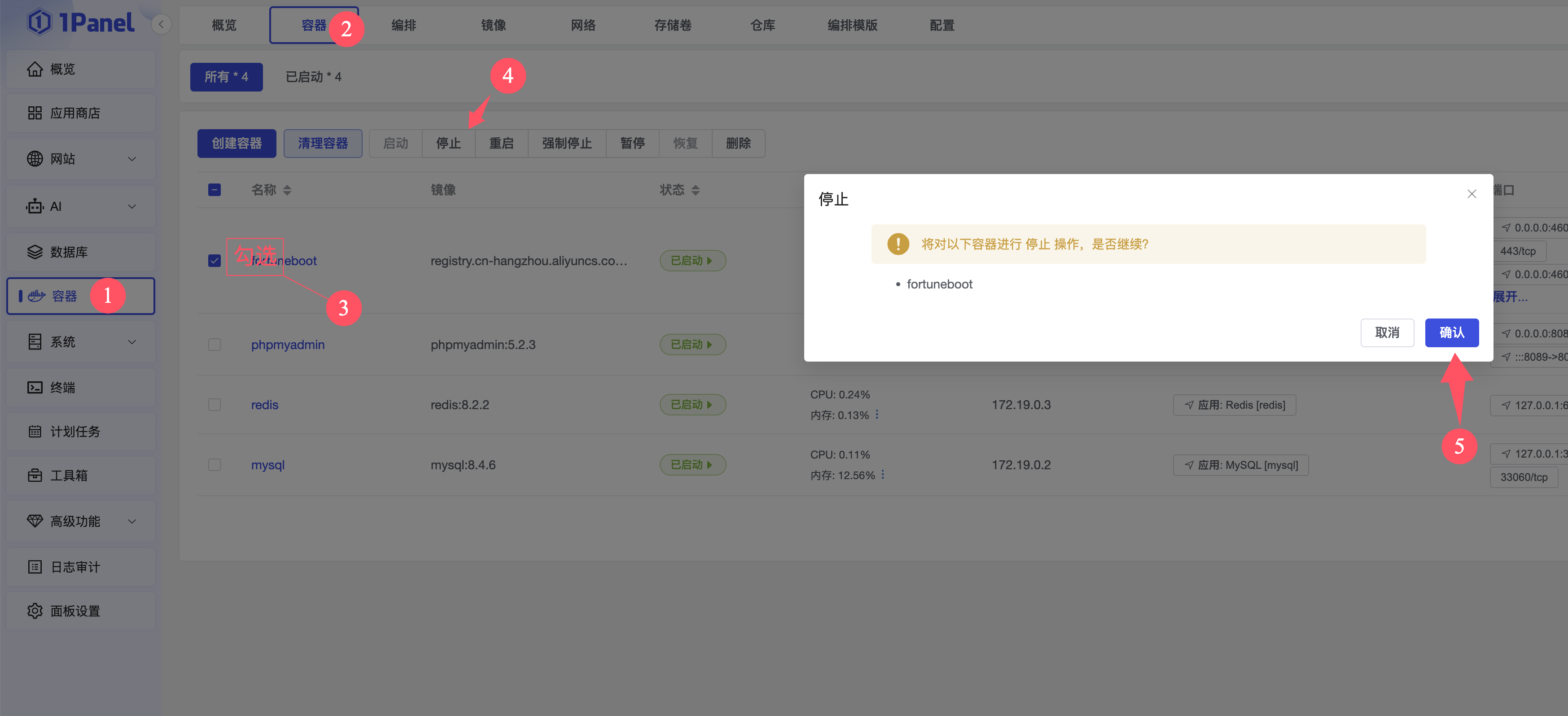 点击容器 -> 点击容器 -> 勾选fortuneboot前面的对勾 -> 点击停止 -> 点击确认