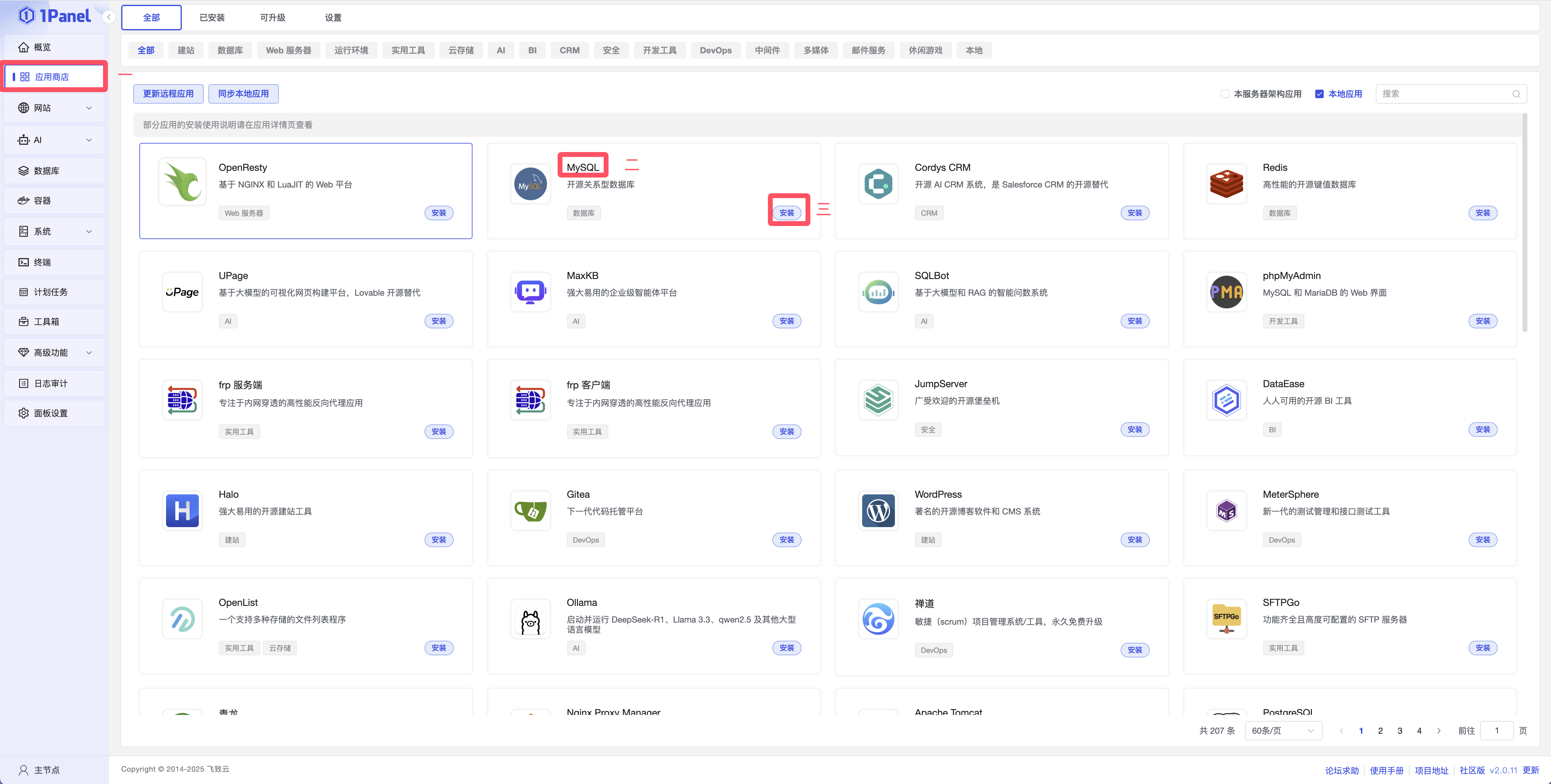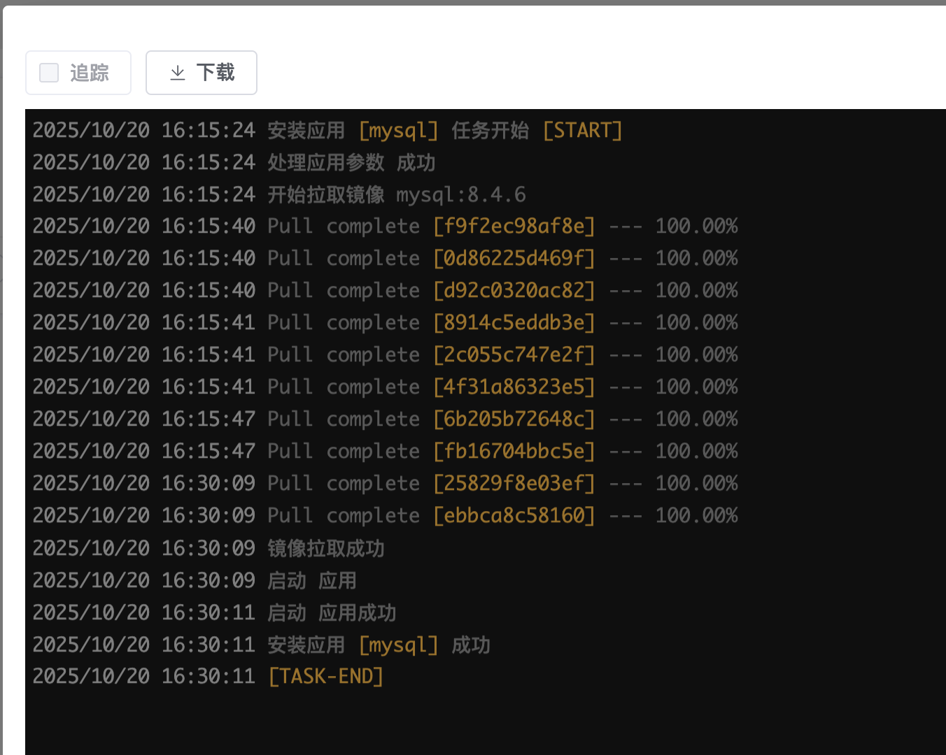 进入1Panel管理页面 -> 点击应用商店 -> 找到MySQL -> 点击安装 -> 在容器名称处输入“mysql” -> 点击确认 -> 点击确认 -> 等待几分钟,根据网络、配置不同等待时间不同 -> 显示[TASK-END]表示安装成功。