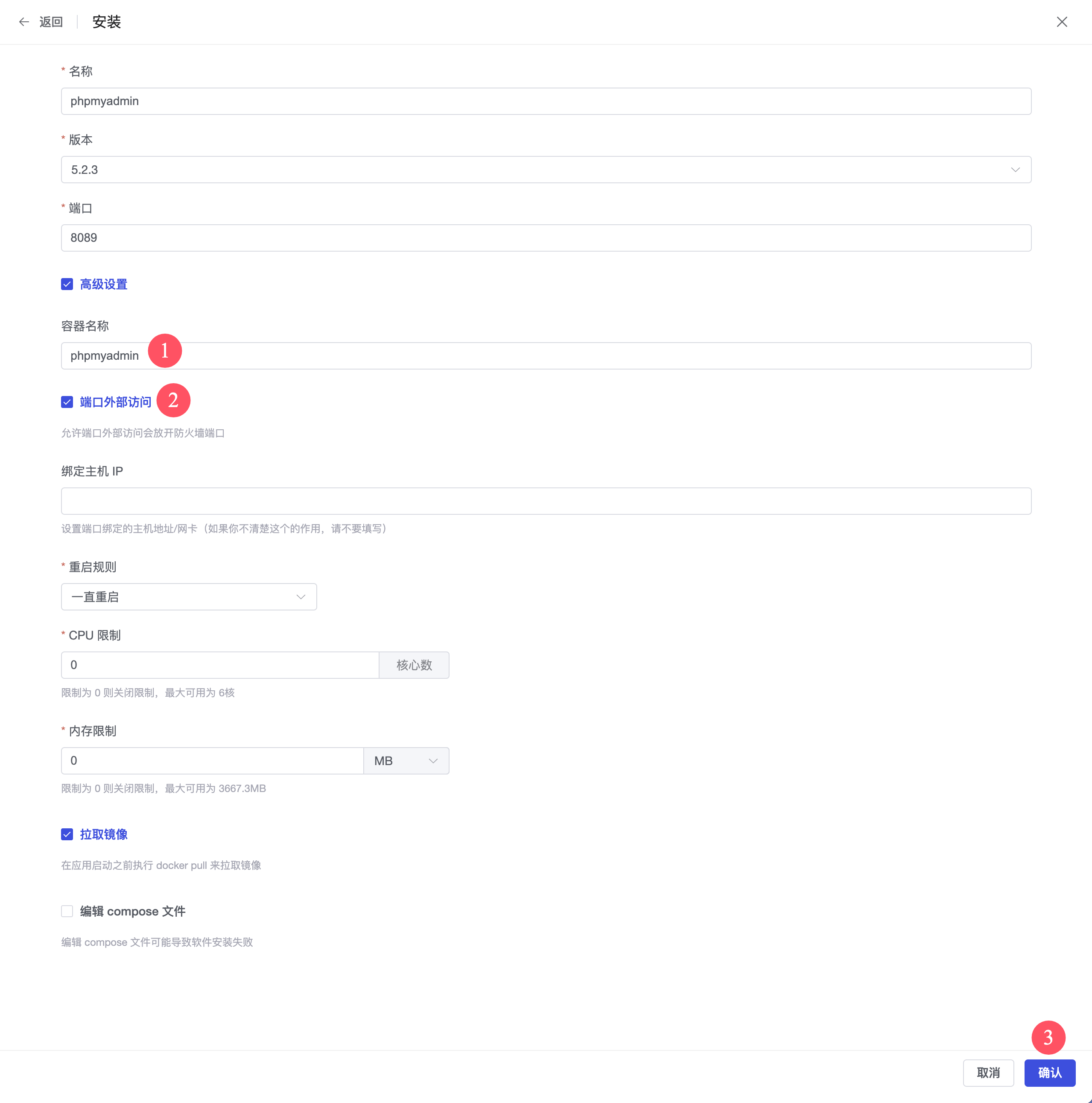容器名称默认是空,需输入"phpmyadmin"、勾选端口外部访问,其他参数保持默认即可,点击确认。