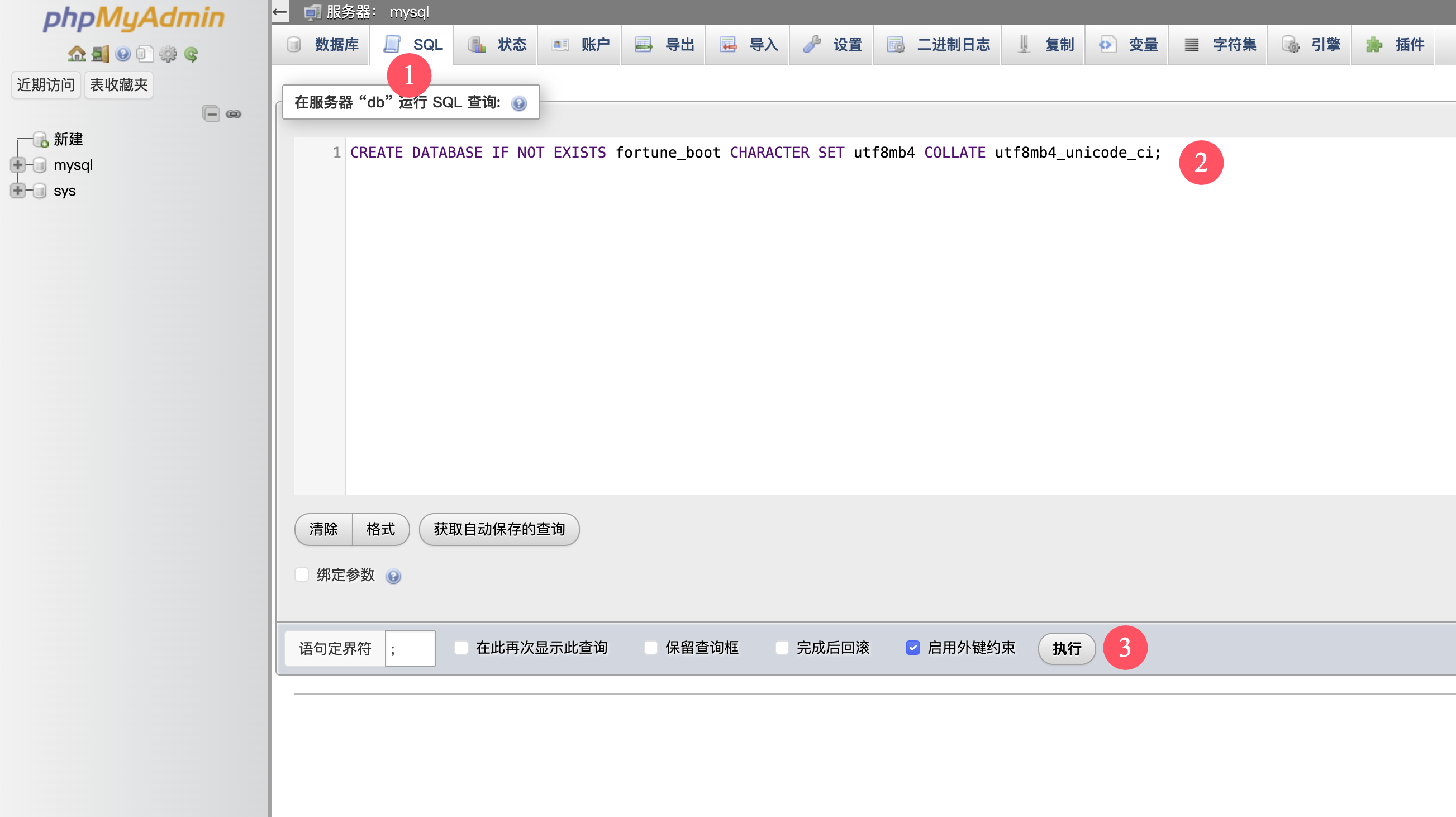 点击SQL -> 输入如下创建数据库的SQL -> 点击执行