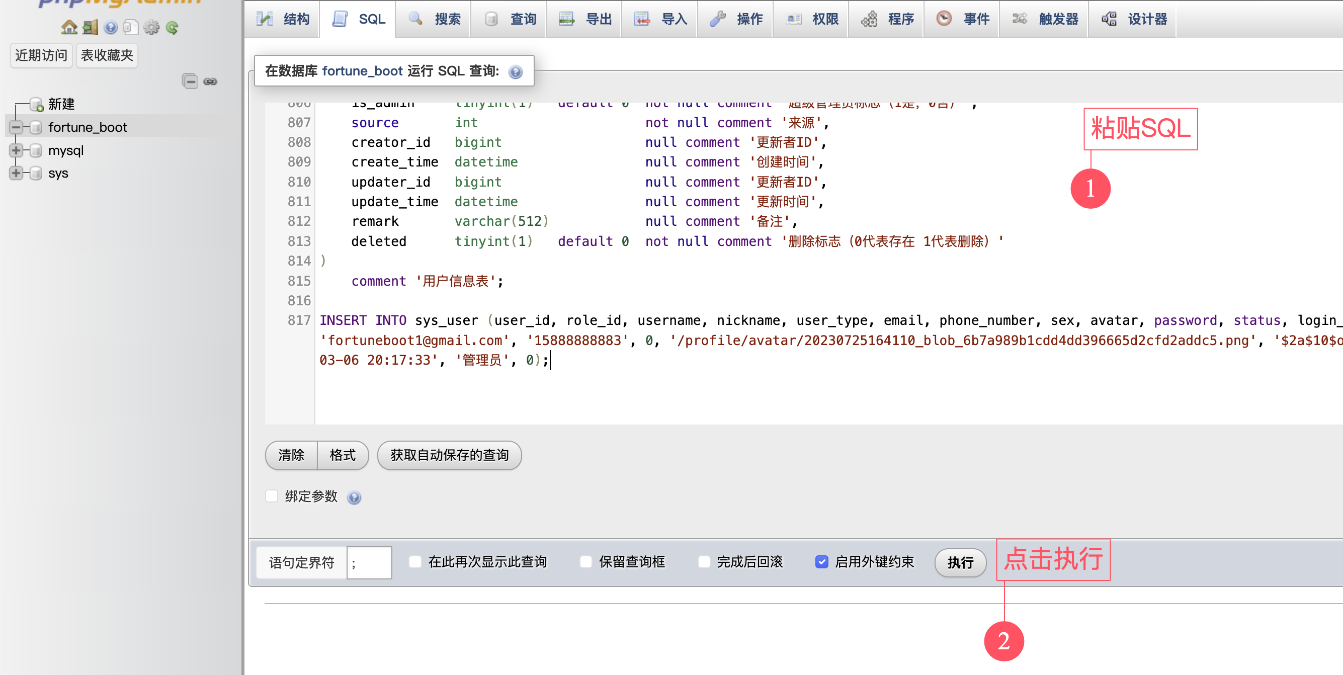 返回phpmyadmin标签 -> 将SQL粘贴进输入框 -> 点击执行