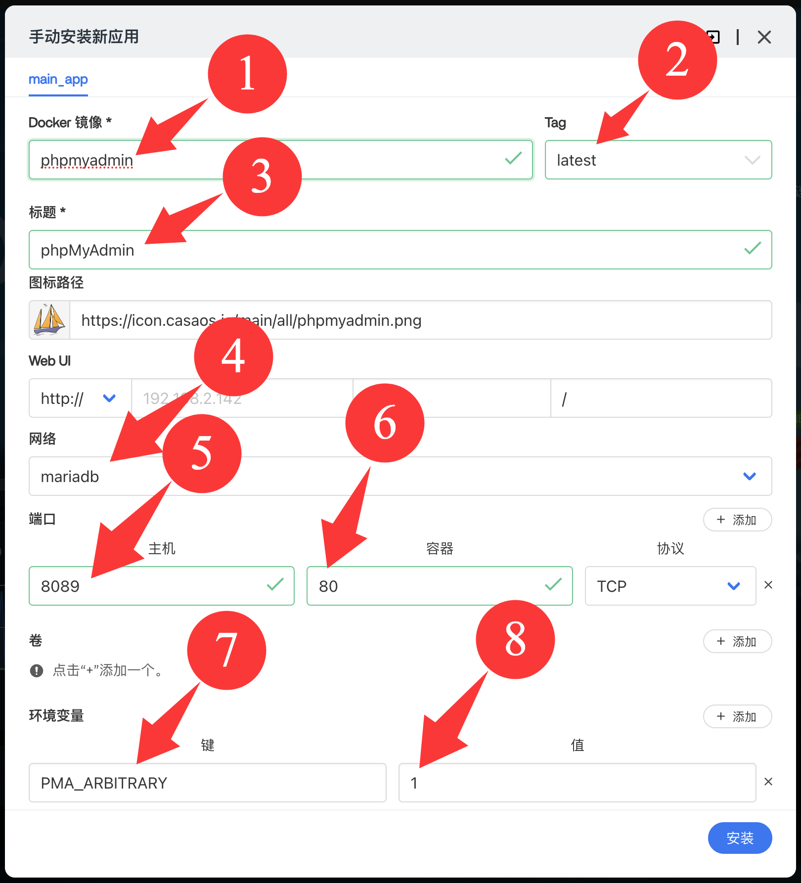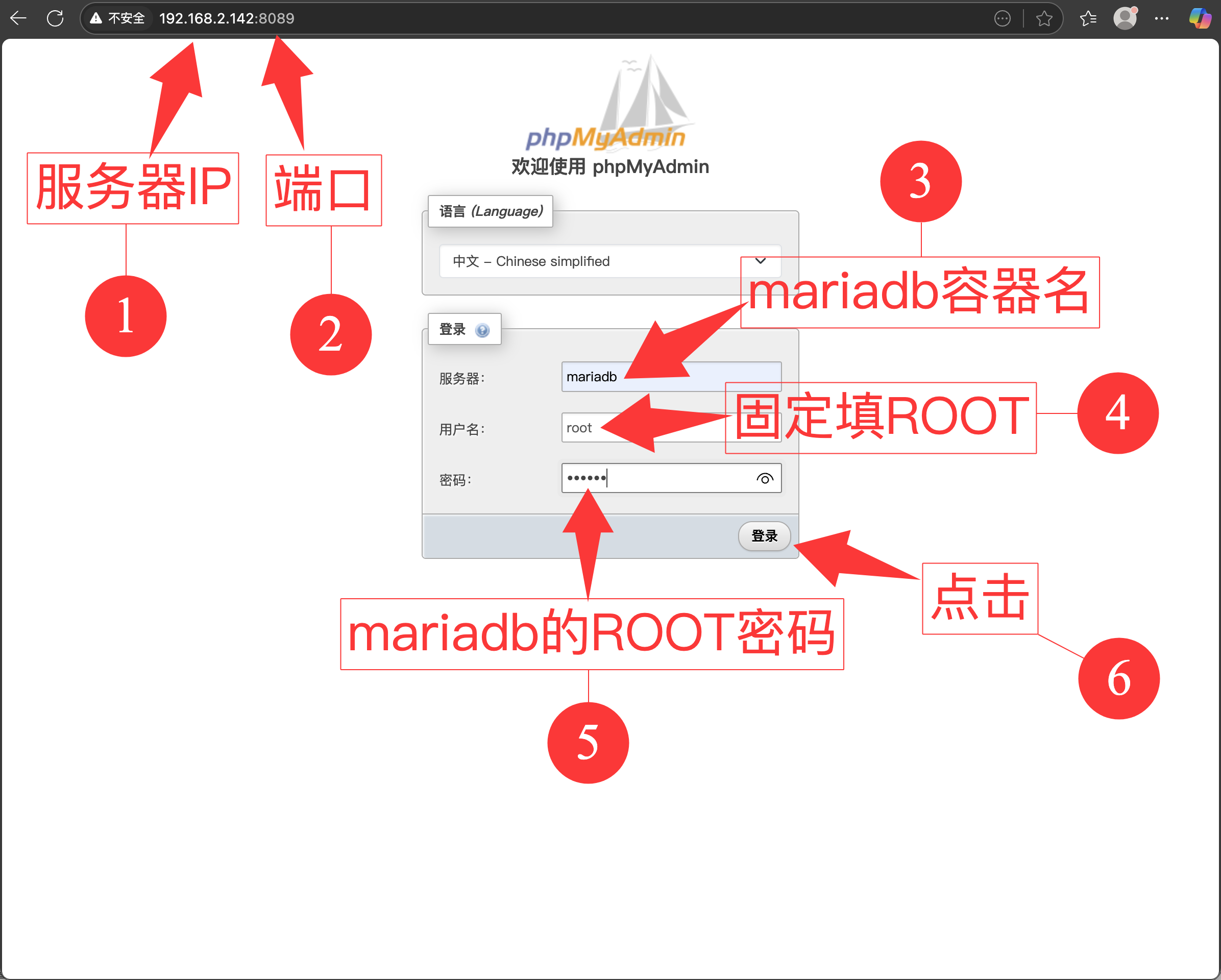打开浏览器 -> 输入ip:端口(服务器的ip、phpMyAdmin的端口在3.2中,用我的默认配置就是8089) -> 输入 mariadb容器名、用户名root、密码在1.2中,没改过的话是:casaos -> 点击登录。