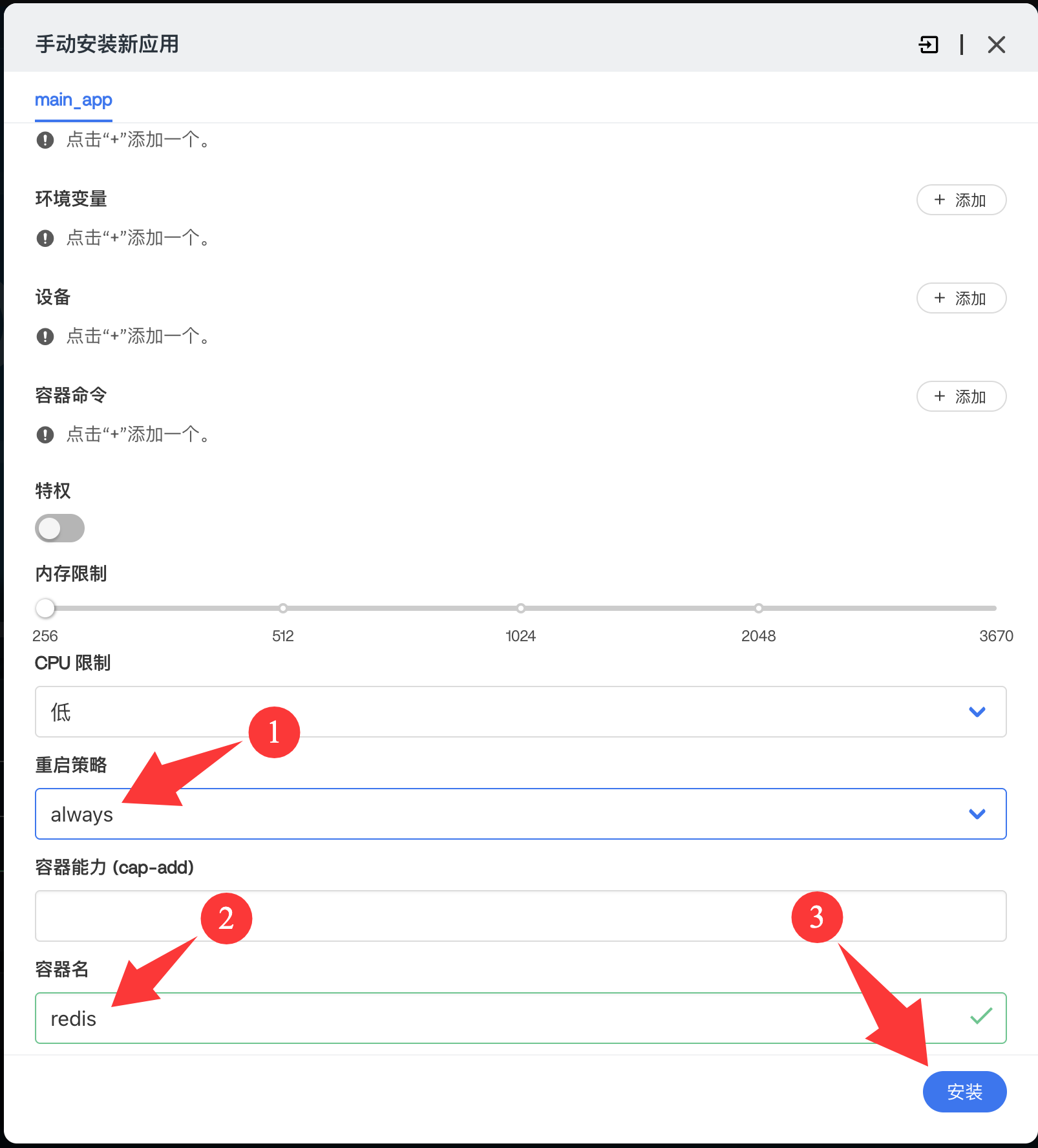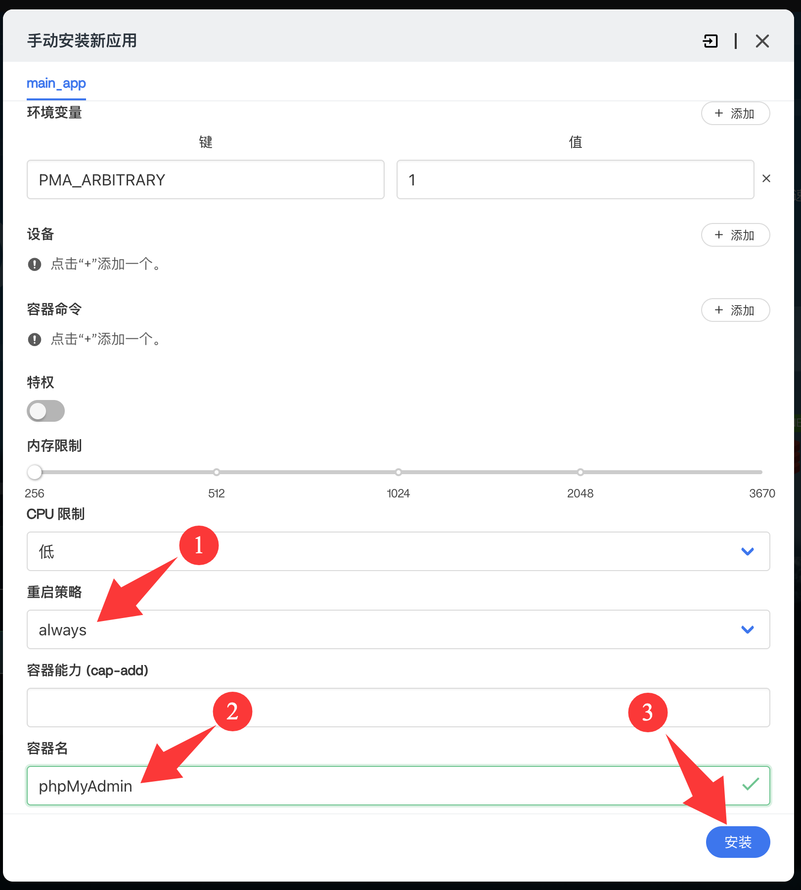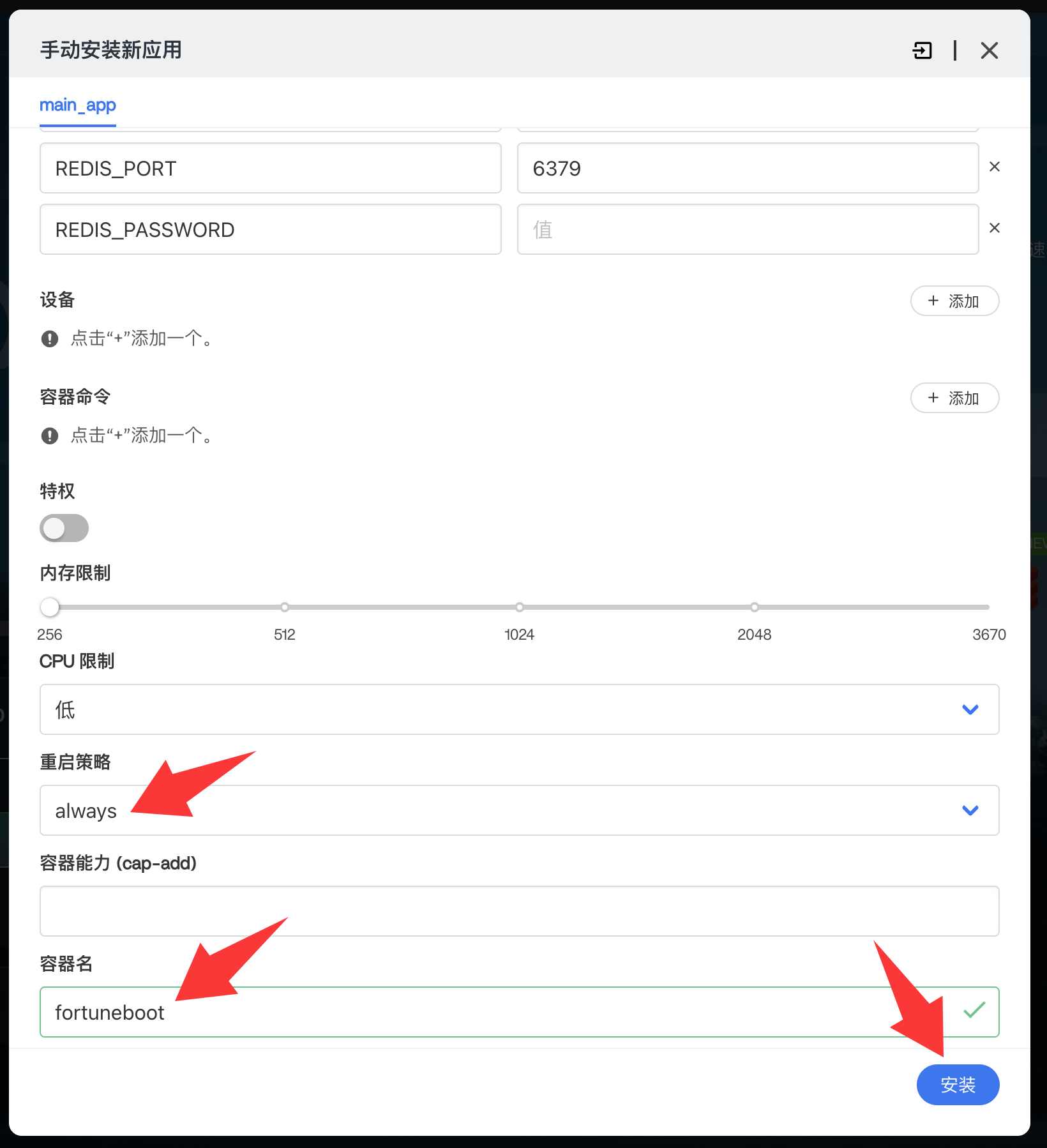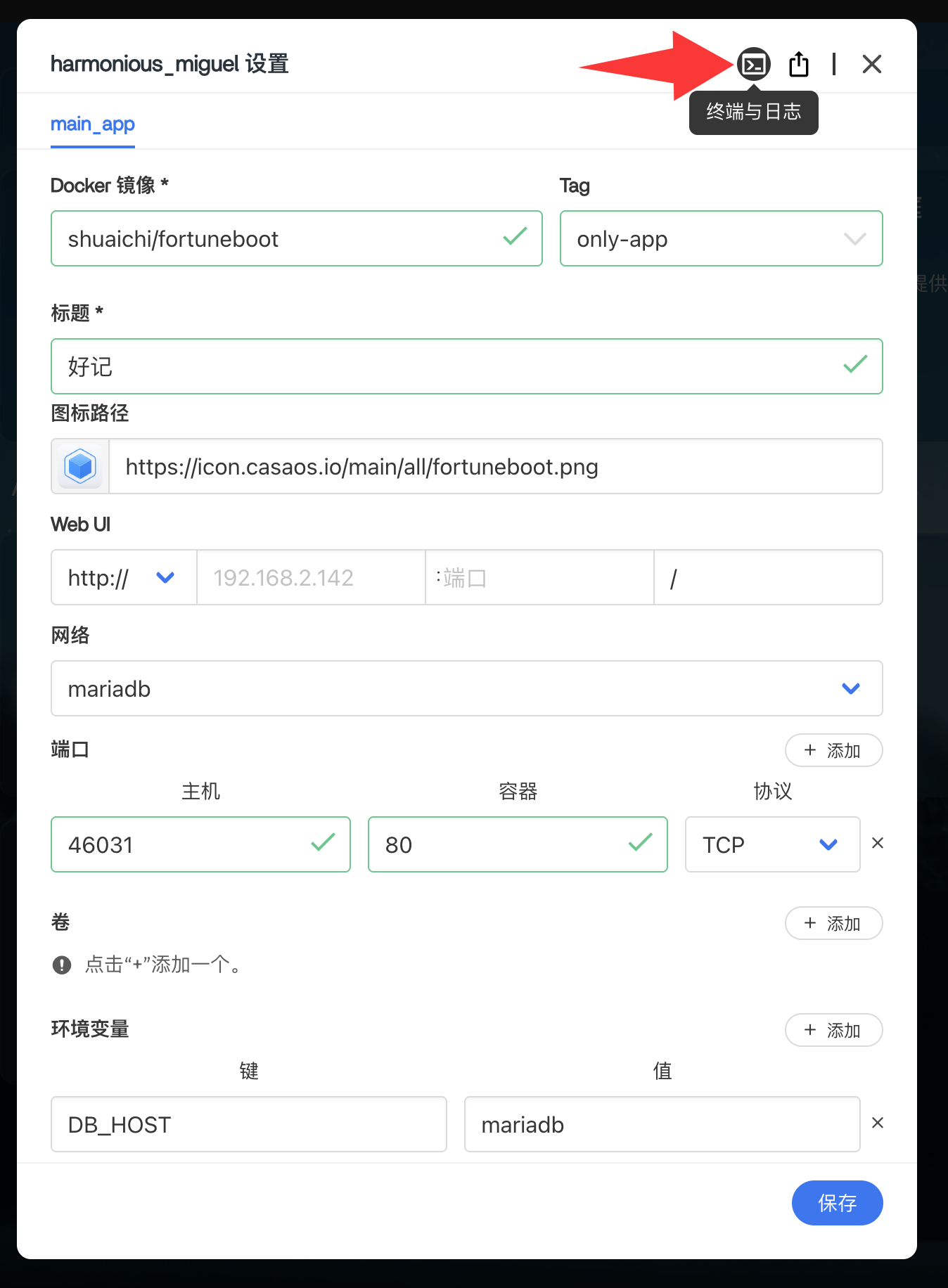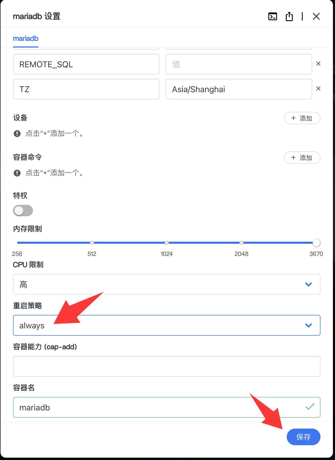 滚动到底部,重启策略默认是unless-stoped,改为always,然后点击确定,等待数据库配置更新完成即可。