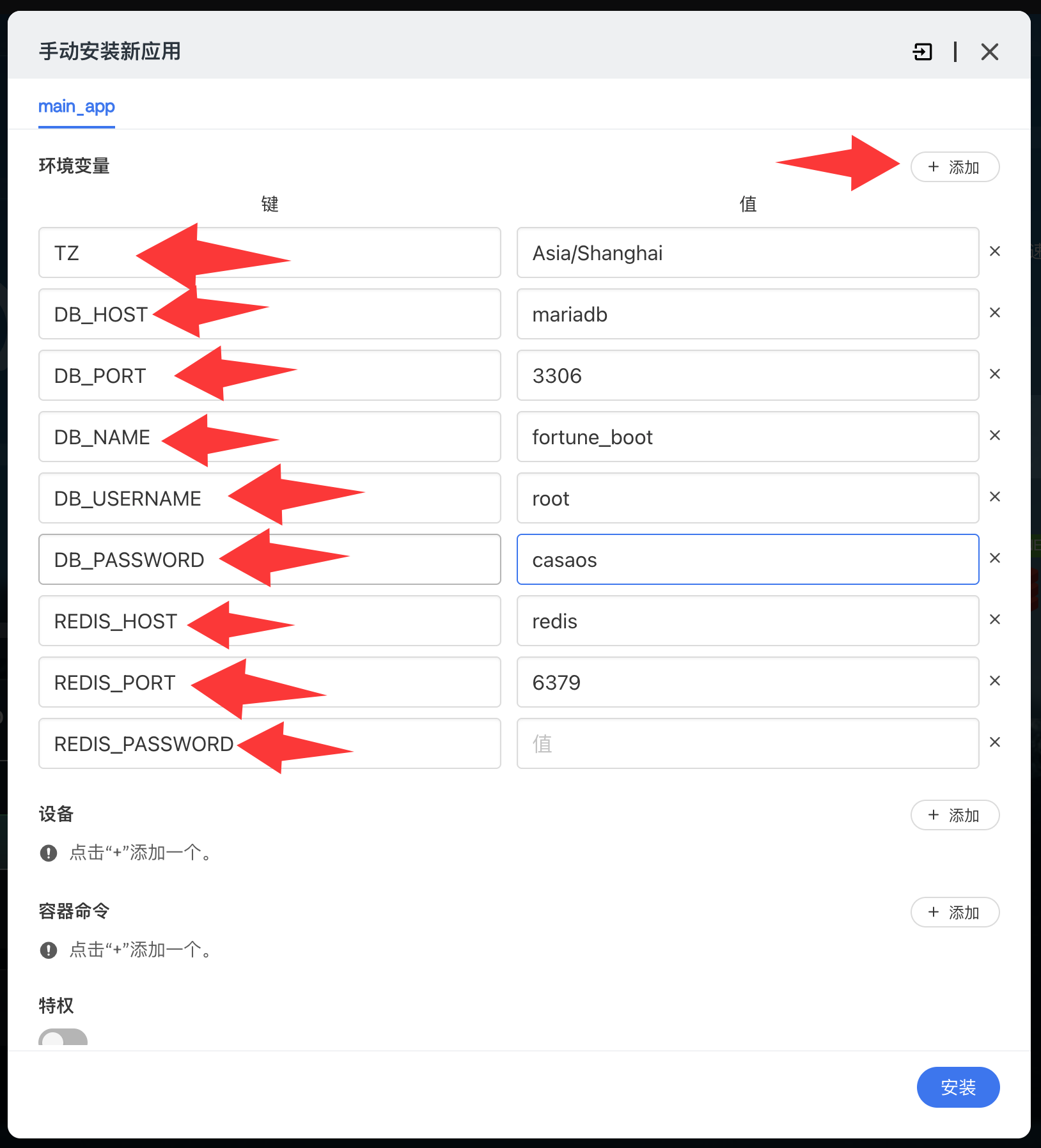 点击 App Store -> 点击右上角自定义安装 -> 参照我下面截图配置填入内容。