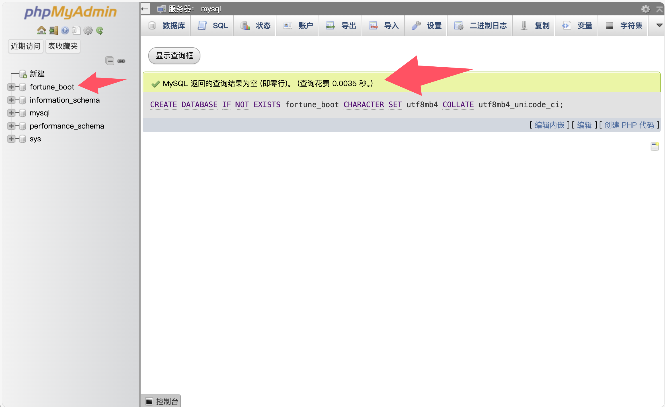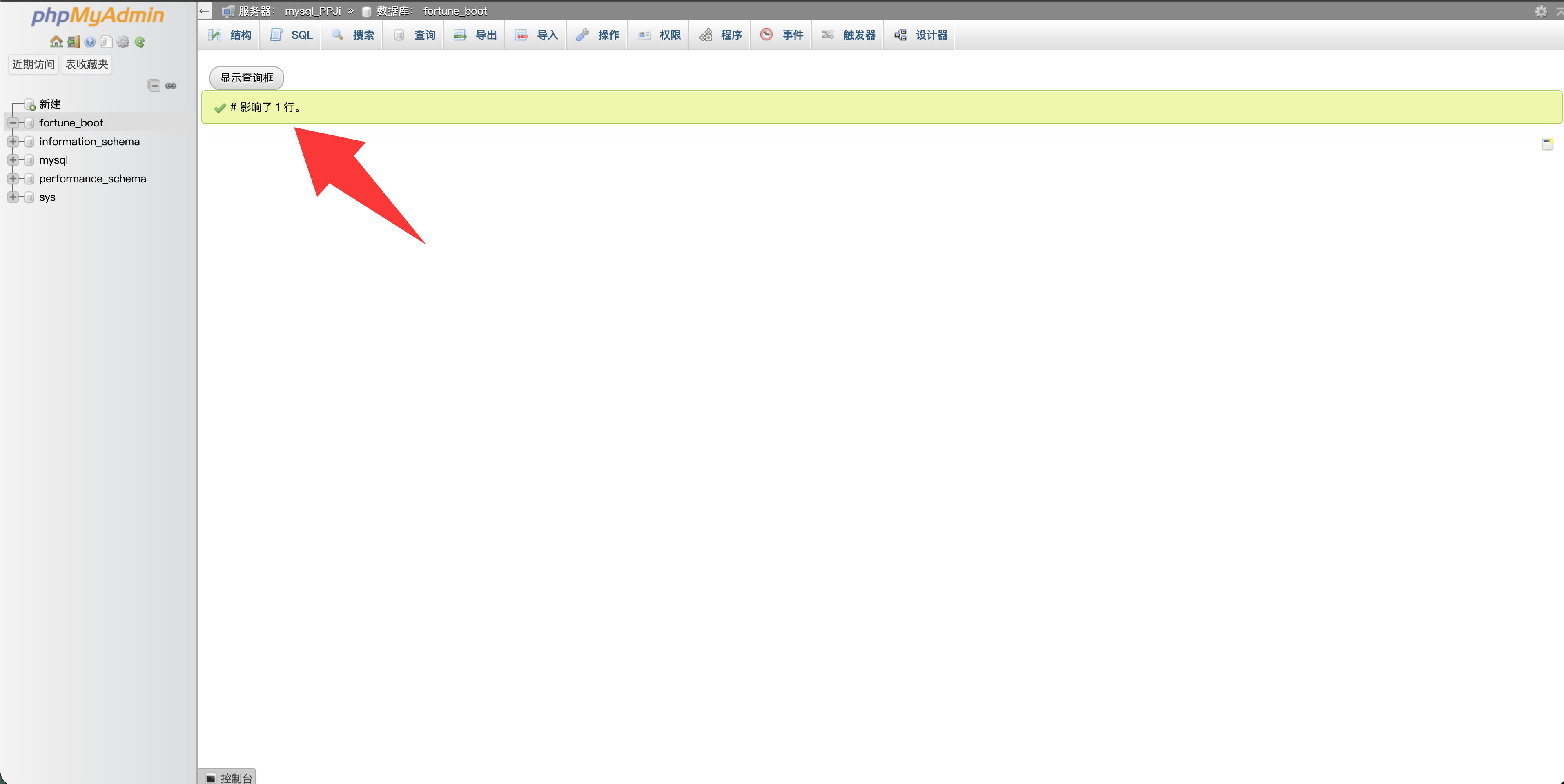 显示如下内容,并且左侧显示一个fortune_boot的数据库,即表示数据库创建成功。