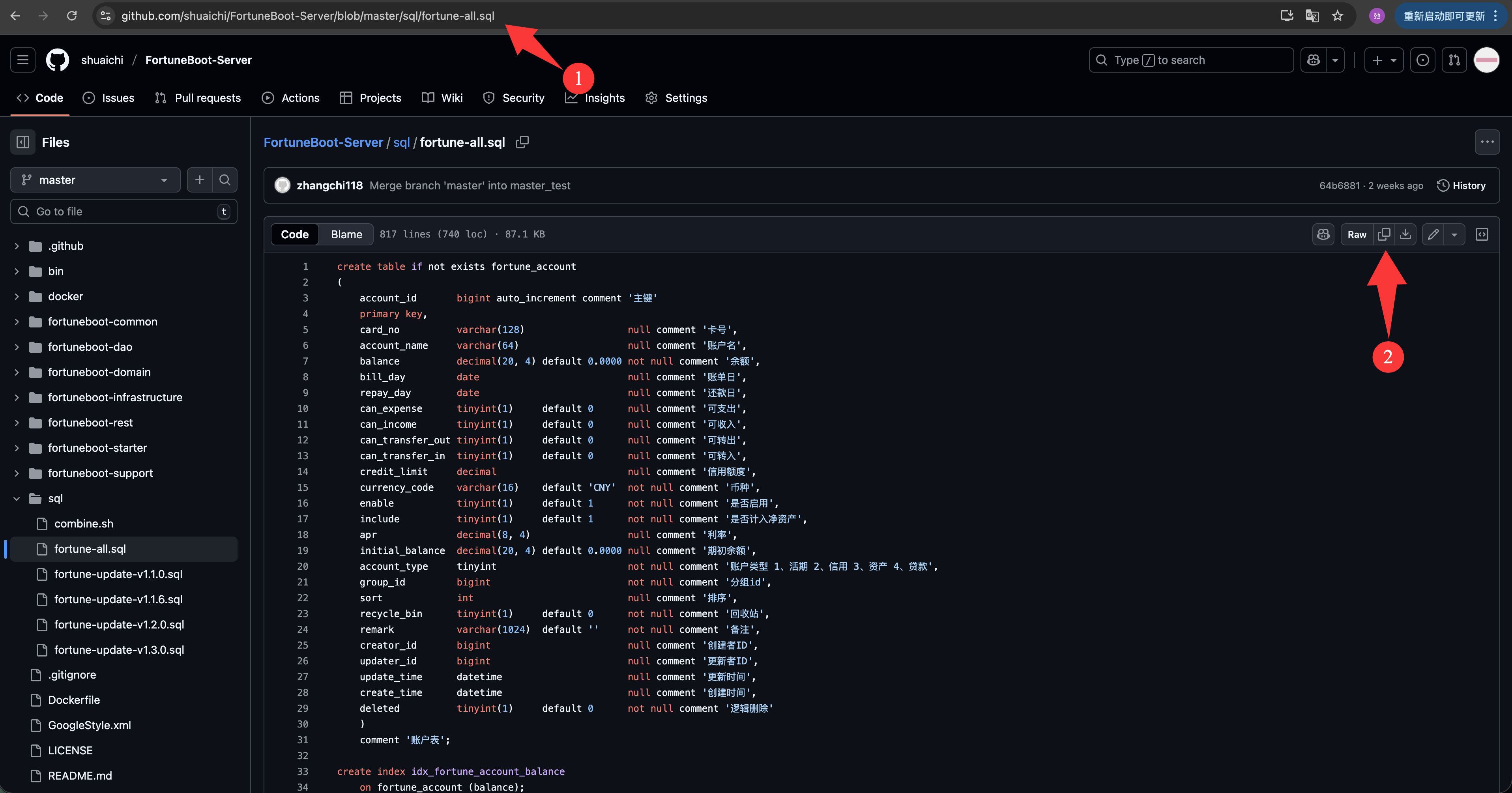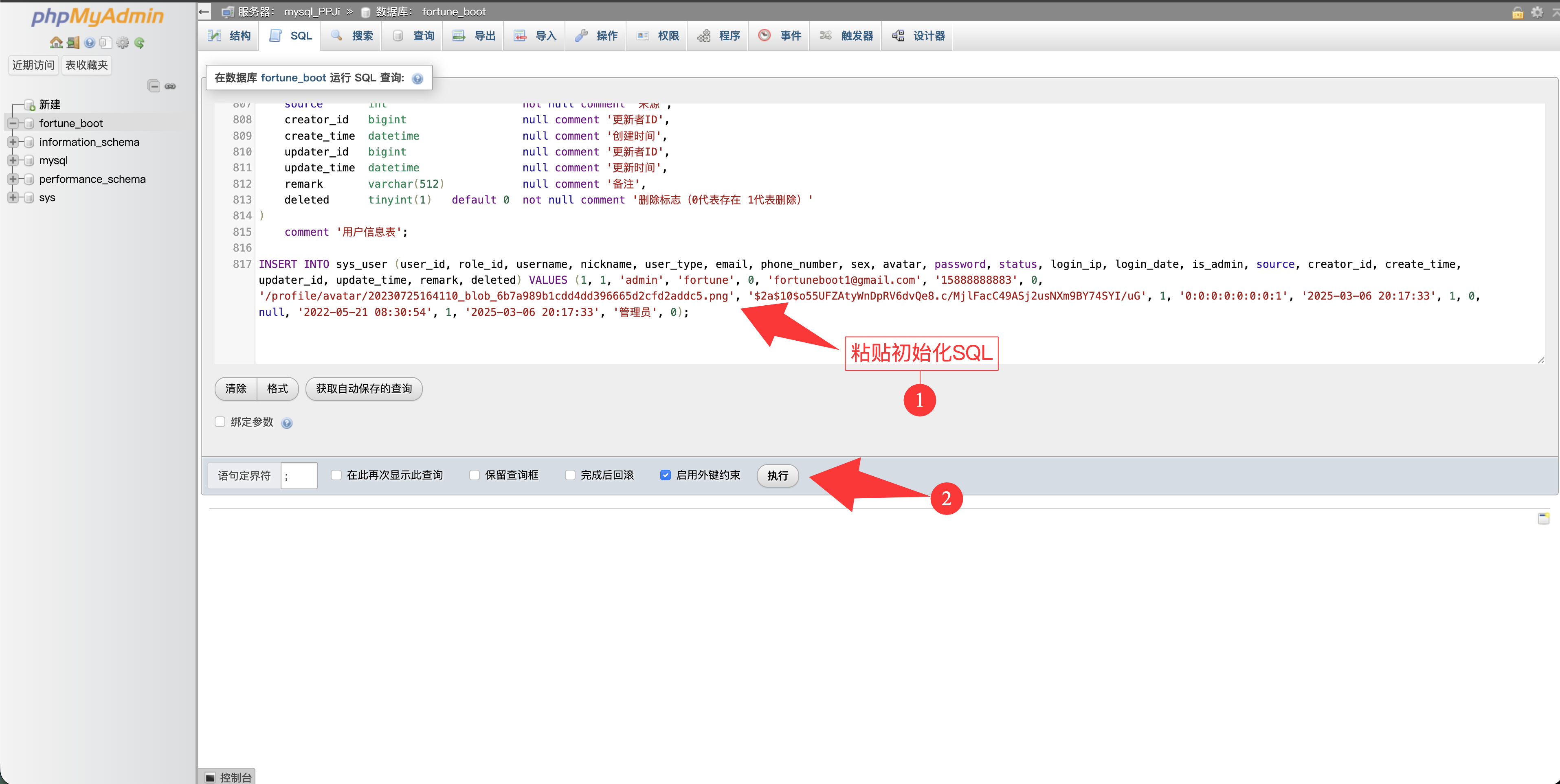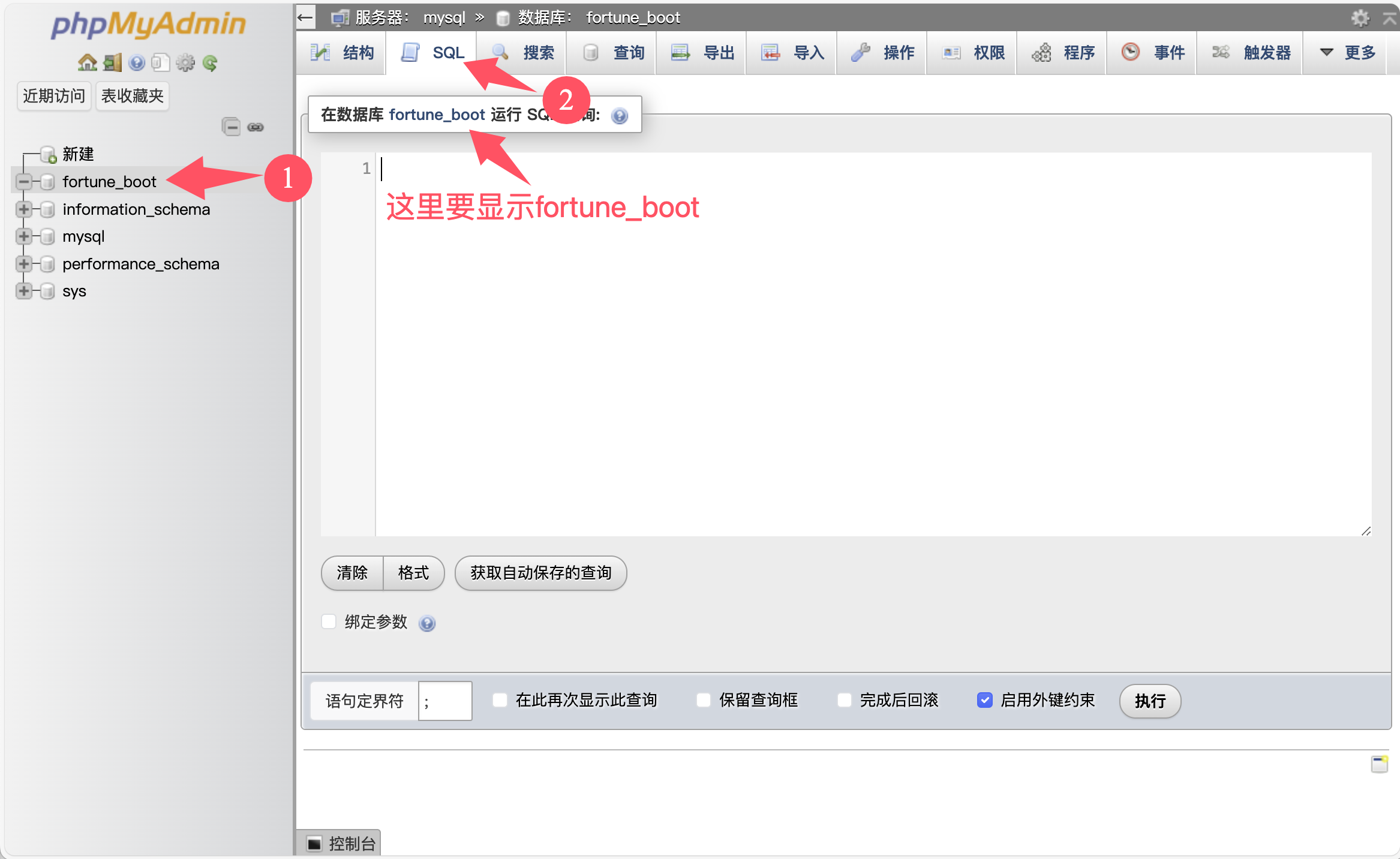 点击左侧的fortune_boot -> 点击SQL -> 打开一个新的浏览器标签页 -> 拷贝初始化SQL -> 在输入框中粘贴初始化SQL -> 点击执行。