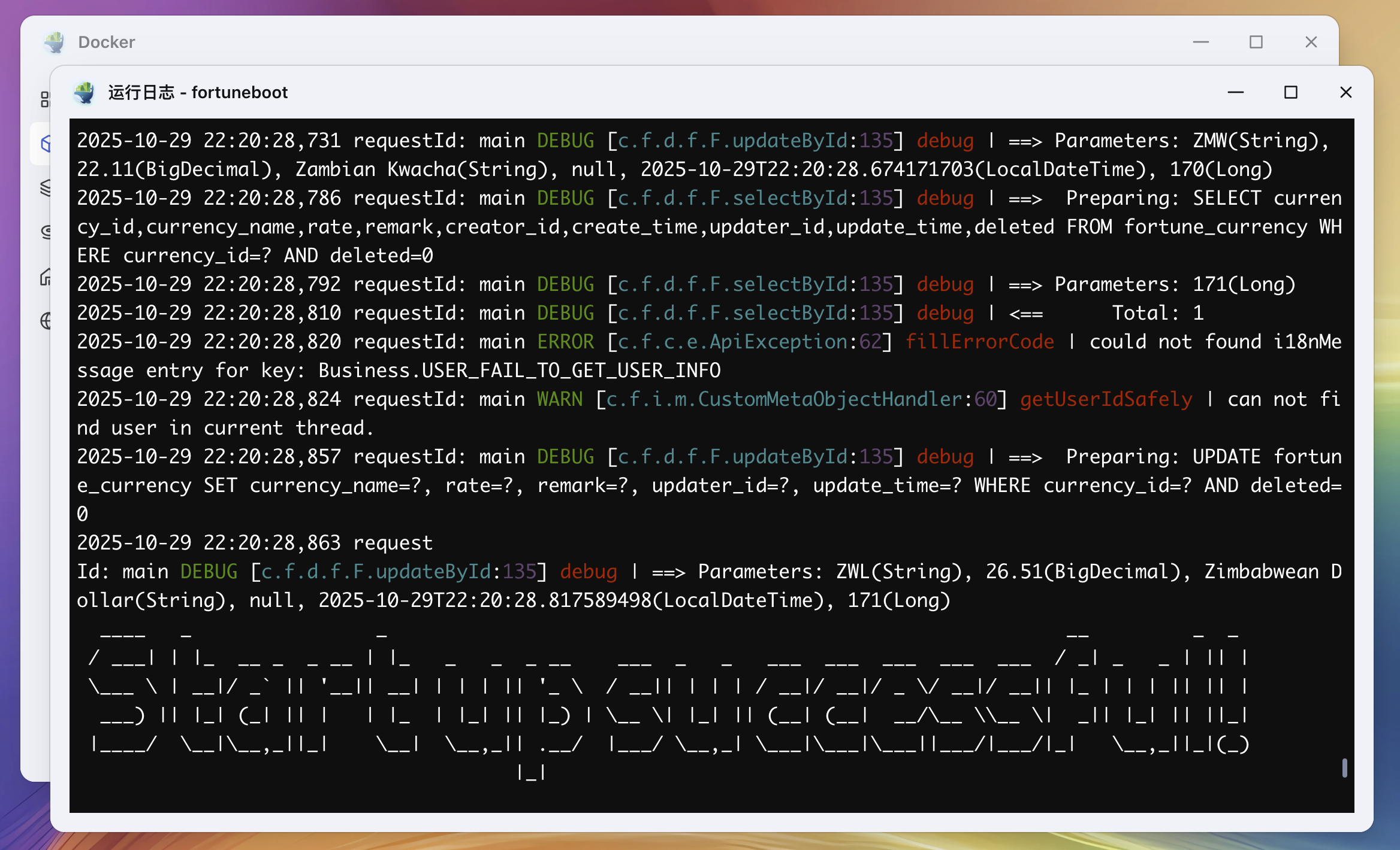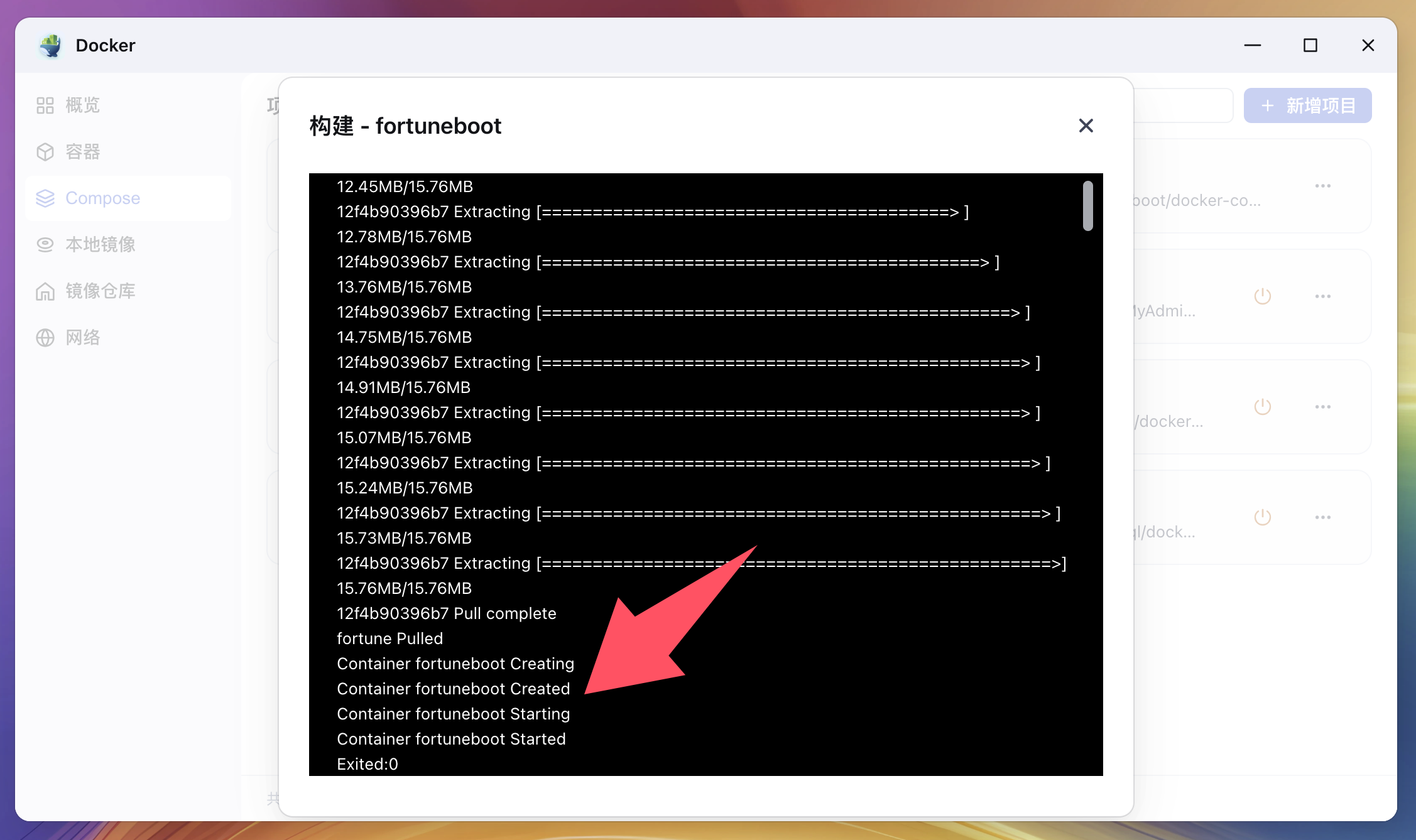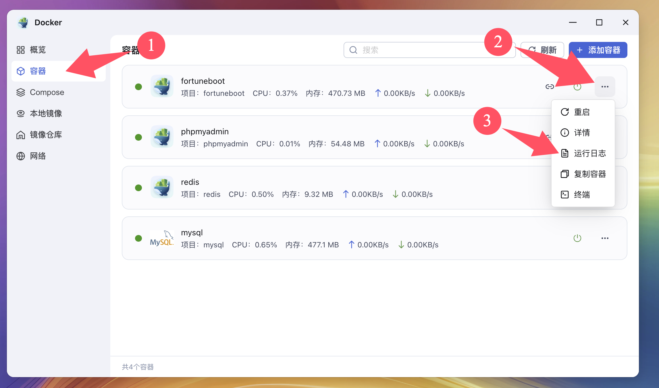 关闭构建页面 -> 点击容器 -> 点击fortuneboot最右侧的三个点 -> 点击运行日志 -> 等待fortuneboot启动完成。
