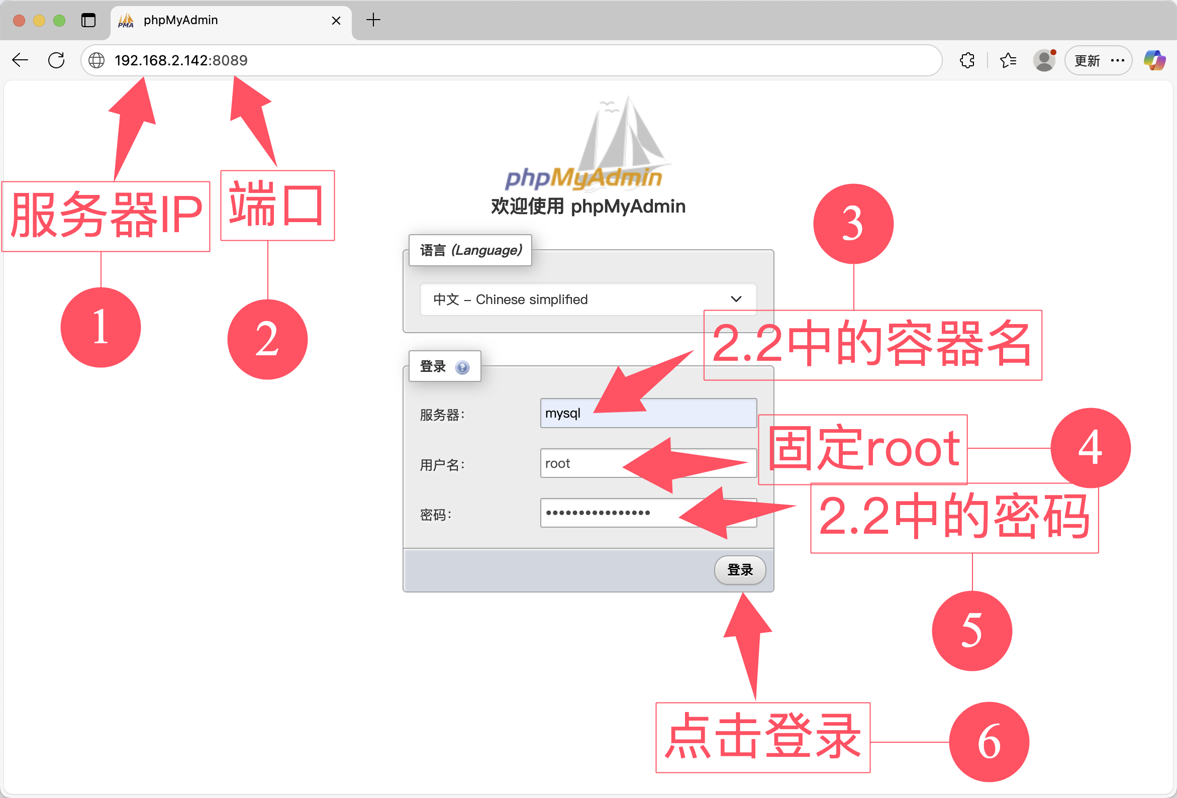 打开浏览器 -> 输入ip:端口(服务器的ip、phpMyAdmin的端口在4.2中,用我的默认配置就是8089) -> 输入 mysql容器名、用户名root、密码在2.2中 -> 点击登录。