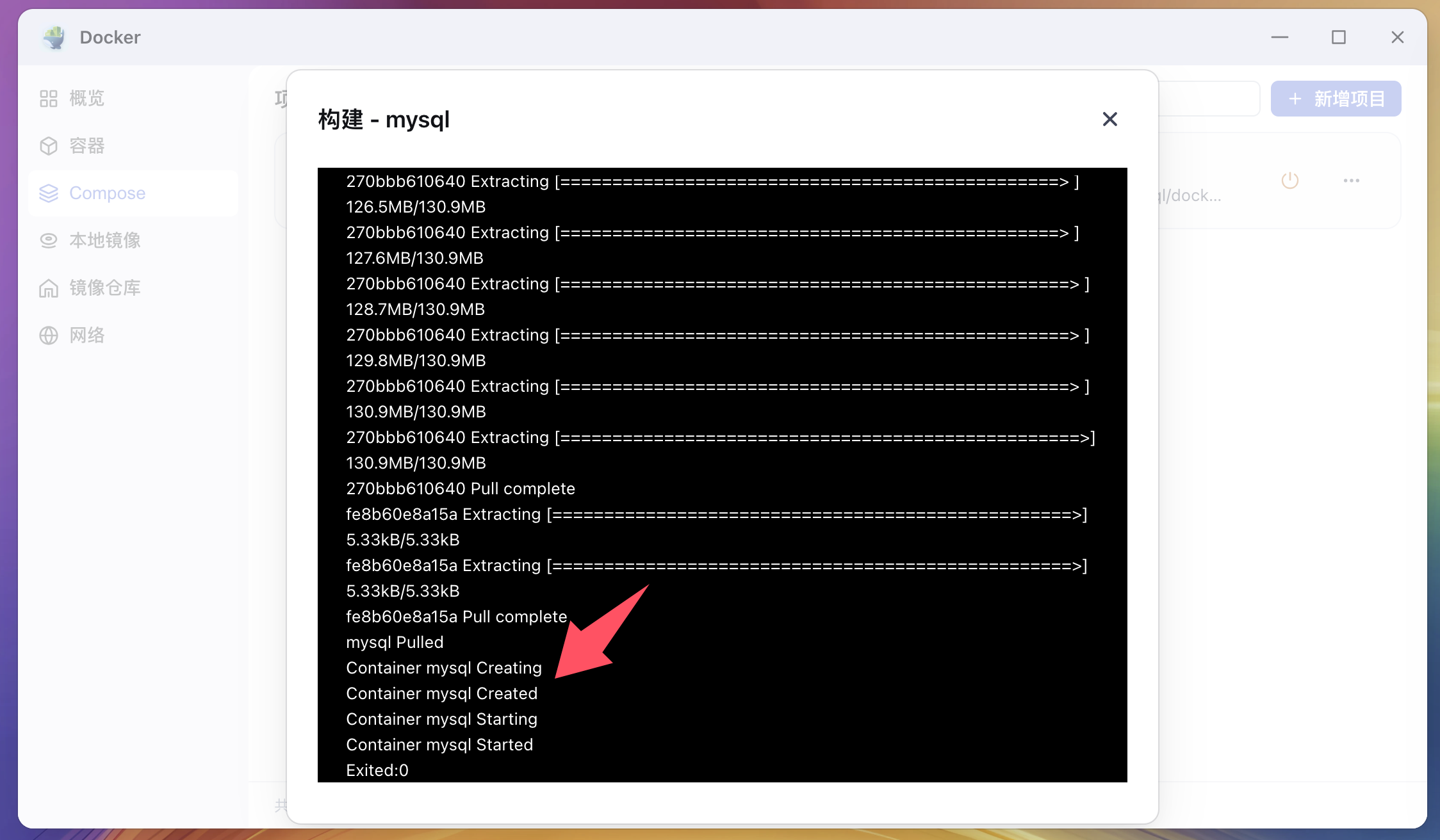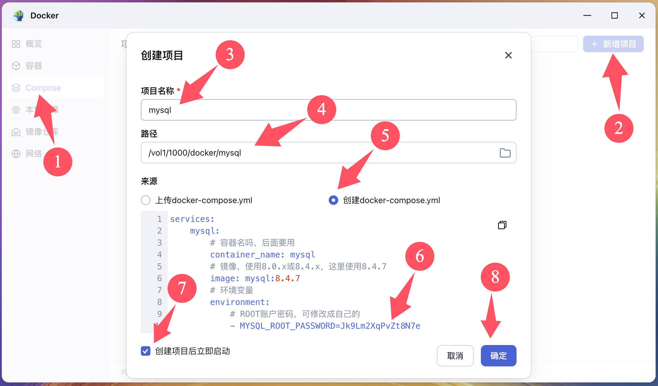 拷贝如下代码 -> 点击Compose -> 点击新增项目 -> 输入项目名称 -> 选择一个mysql存放路径 -> 点击创建docker-compose.yml -> 将刚才拷贝的代码粘贴到文本框中 -> 可以修改ROOT帐户密码 -> 点击创建项目后立即启动 -> 点击确定 -> 等待数据库安装成功。