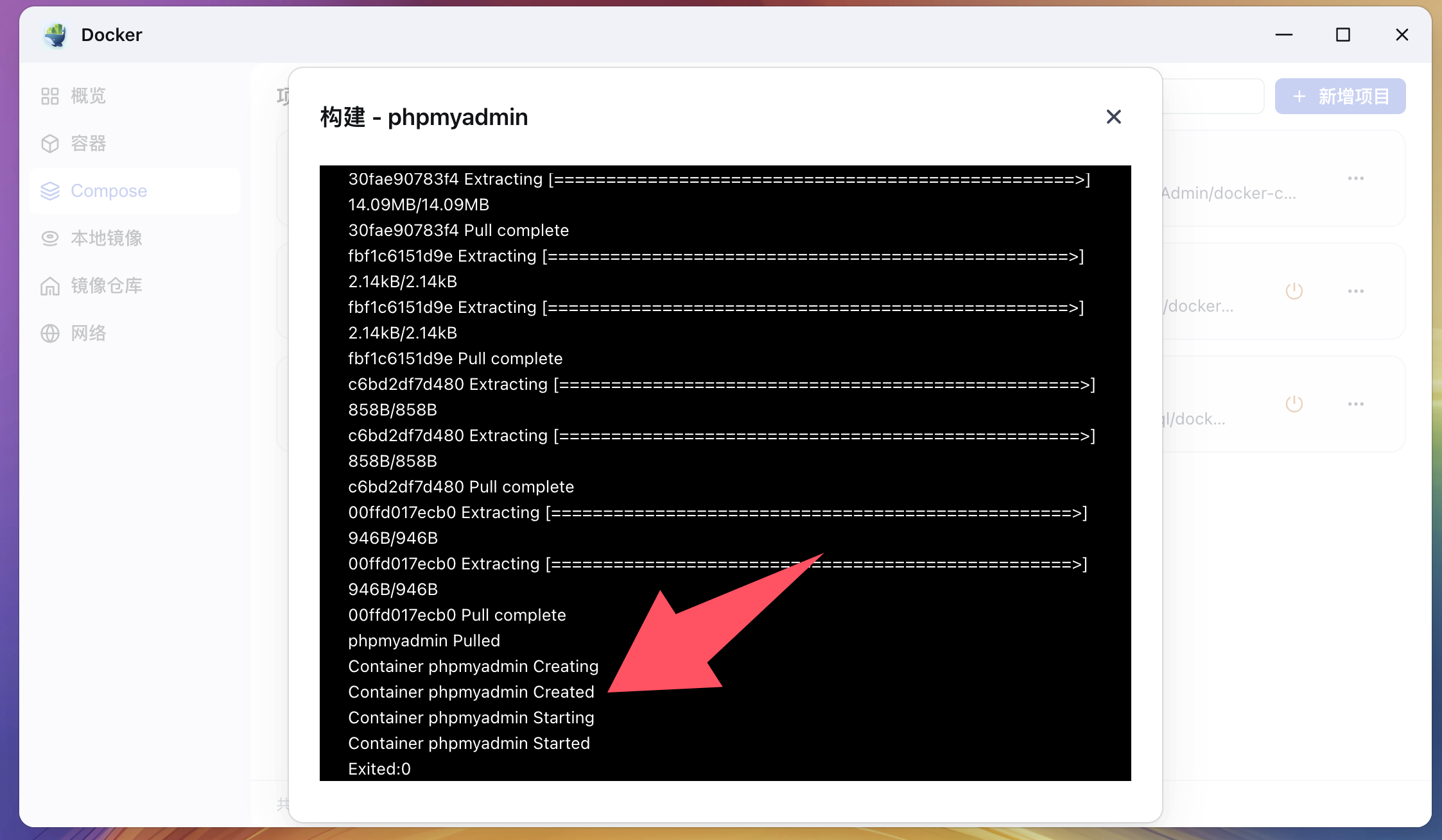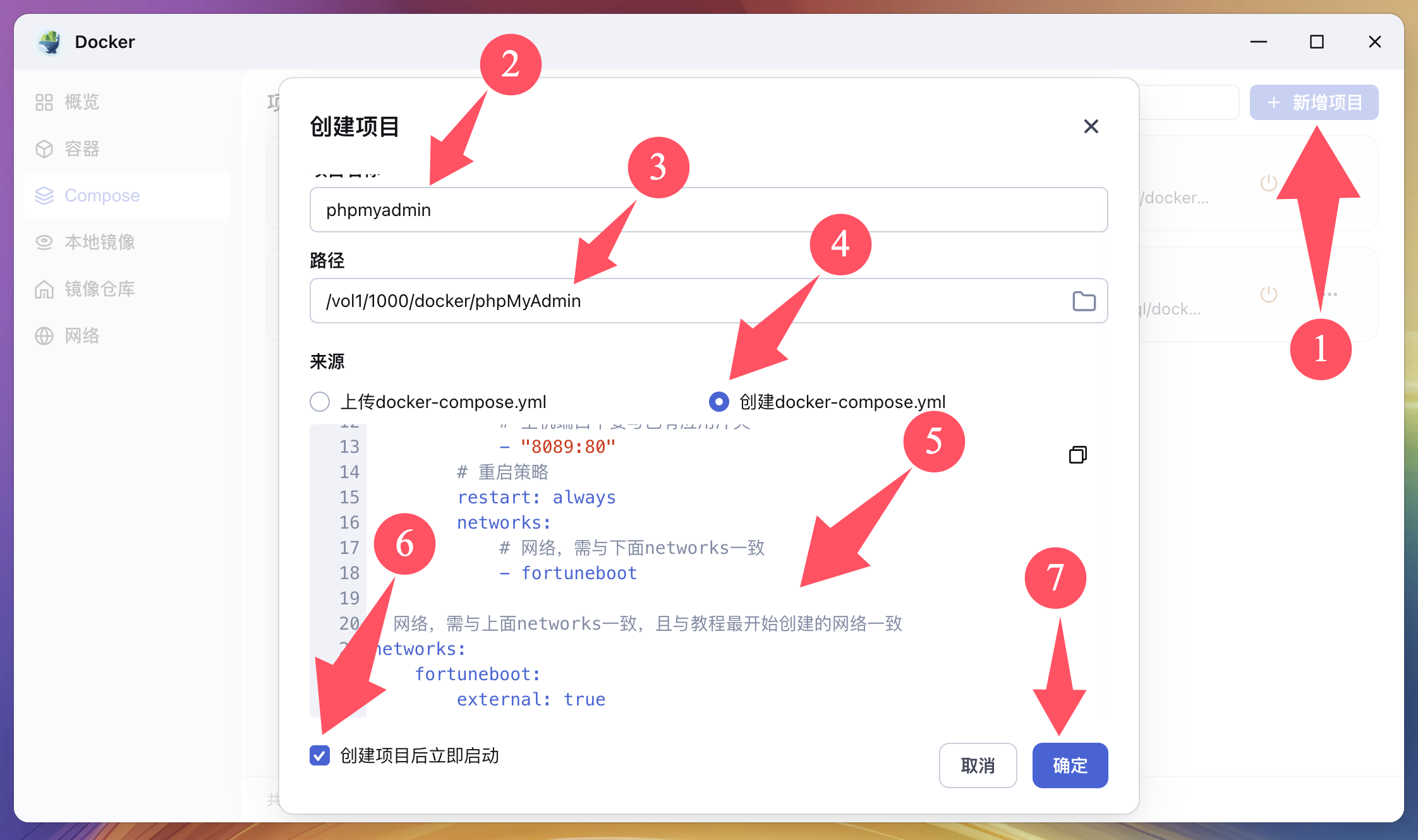 拷贝如下代码 -> 再次点击新增项目 -> 输入项目名称 -> 选择一个phpMyAdmin存放路径 -> 点击创建docker-compose.yml -> 将刚才拷贝的代码粘贴到文本框中 -> 可以修改密码 -> 点击创建项目后立即启动 -> 点击确定 -> 等待phpMyAdmin安装成功。