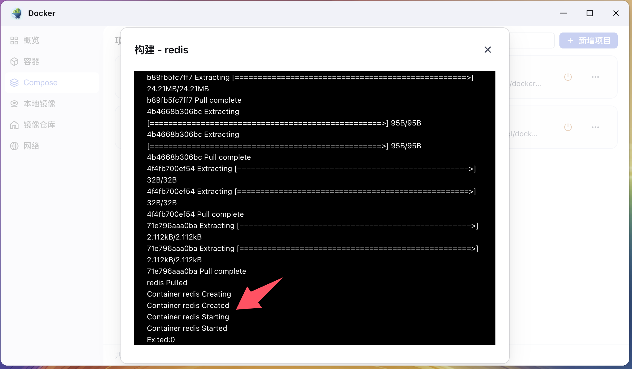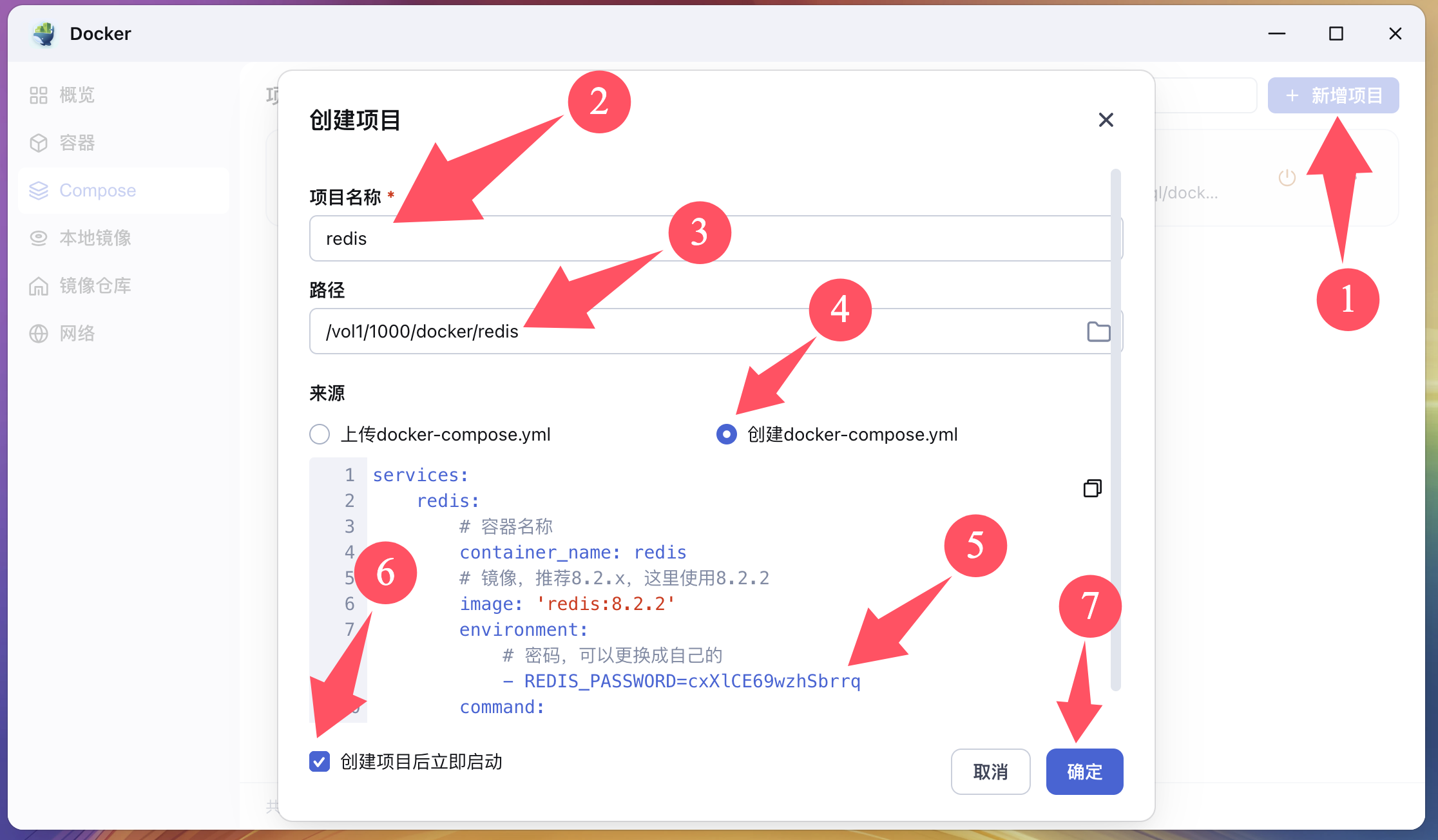 拷贝如下代码 -> 再次点击新增项目 -> 输入项目名称 -> 选择一个redis存放路径 -> 点击创建docker-compose.yml -> 将刚才拷贝的代码粘贴到文本框中 -> 可以修改密码 -> 点击创建项目后立即启动 -> 点击确定 -> 等待Redis安装成功。