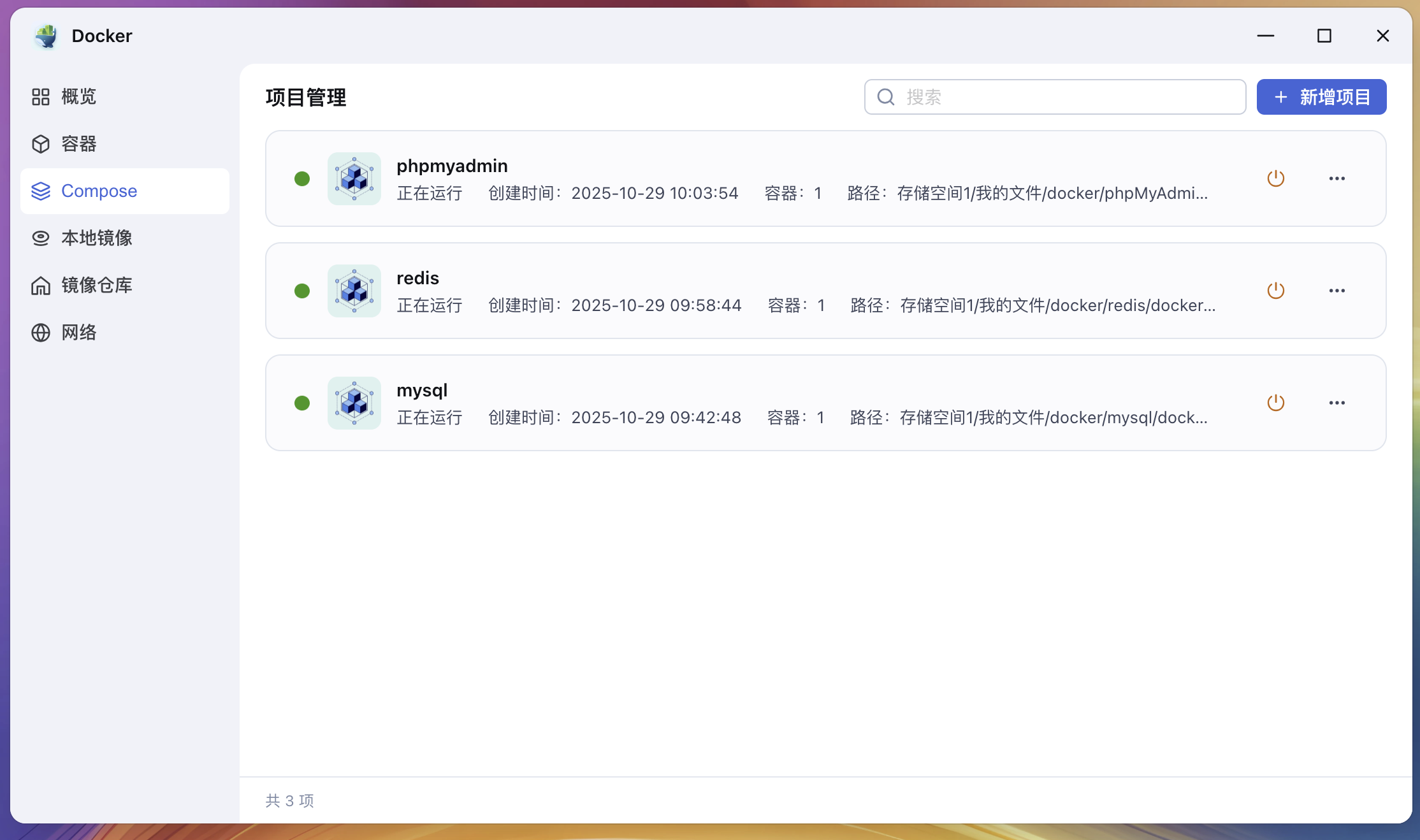 以上三个应用完全部署成功后compose页面显示如下所示: