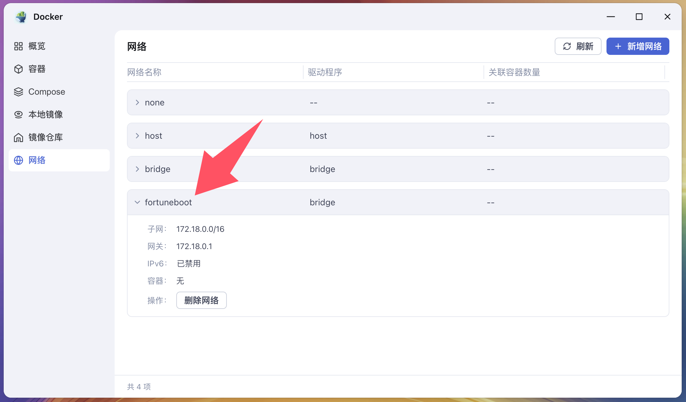 登录飞牛OS的WEB端 -> 点击Docker -> 点击网络 -> 点击新增网络 -> 输入网络名fortuneboot -> 点击确认。