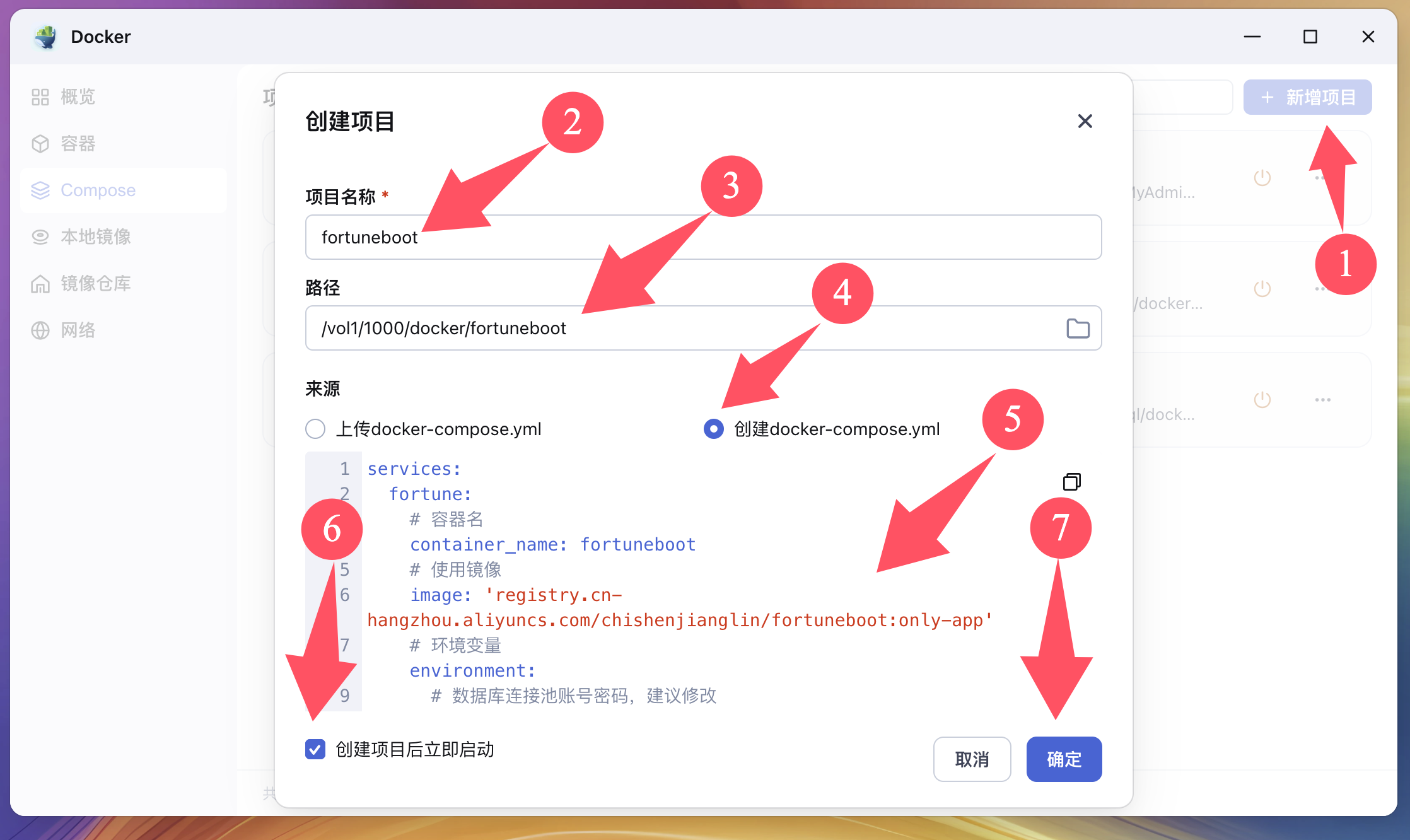拷贝如下代码 -> 再次点击新增项目 -> 输入项目名称 -> 选择一个fortuneboot存放路径 -> 点击创建docker-compose.yml -> 将刚才拷贝的代码粘贴到文本框中 -> 如果上述部署数据库/Redis时,修改了密码等配置,需要修改对应配置 -> 点击创建项目后立即启动 -> 点击确定 -> 等待fortuneboot安装成功。